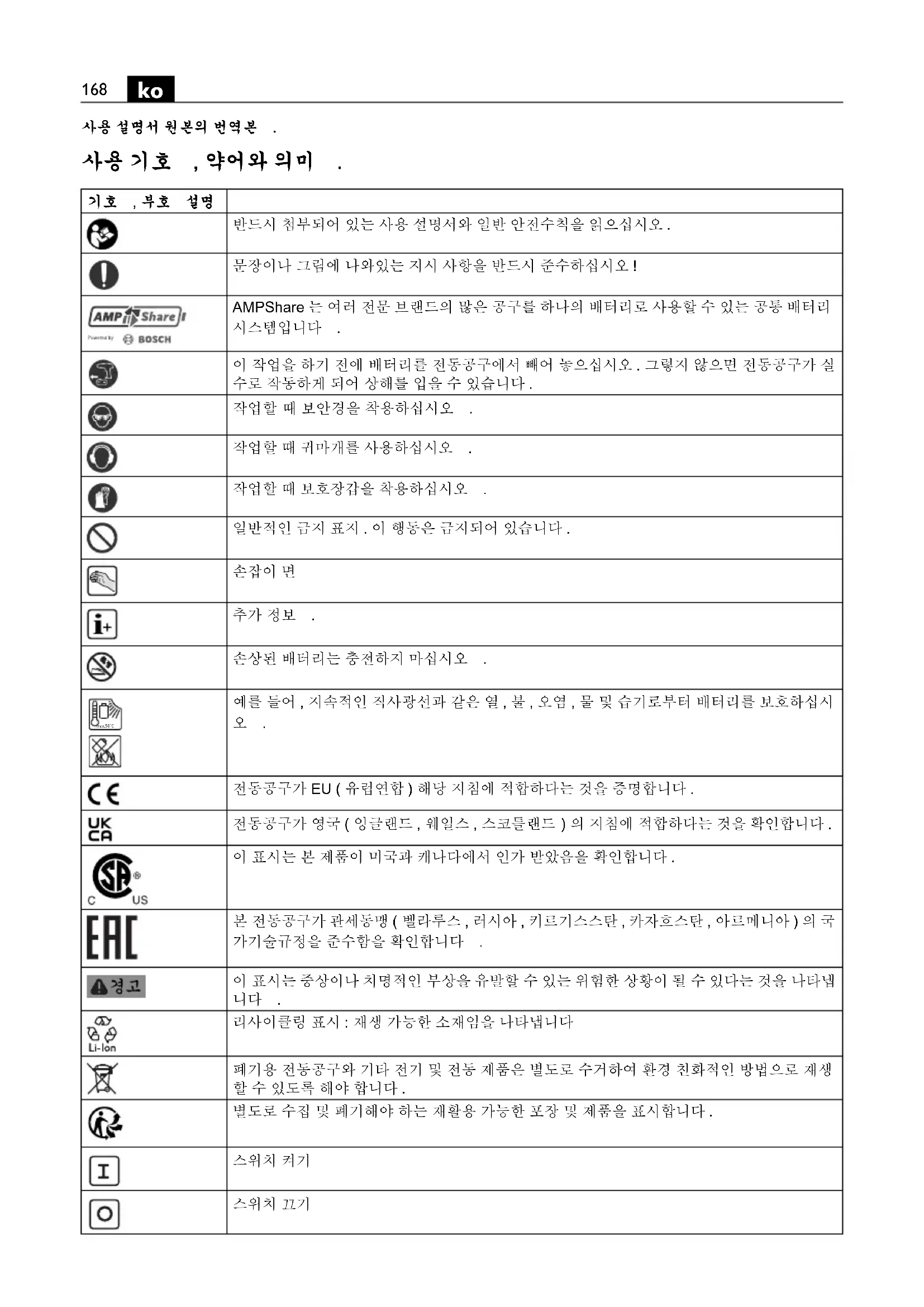 전동공구가 EU ( 유럽연합 ) 해당 지침에 적합하다는 것을 증명합니다 . 전동공구가 영국 ( 잉글랜드 , 웨일스 , 스코틀랜드 ) 의 지침에 적합하다는 것을 확인합니다 . 이 표시는 본 제품이 미국과 캐나다에서 인가 받았음을 확인합니다 . 본 전동공구가 관세동맹 ( 벨라루스 , 러시아 , 키르기스스탄 , 카자흐스탄 , 아르메니아 ) 의 국 가기술규정을 준수함을 확인합니다 . 이 표시는 중상이나 치명적인 부상을 유발할 수 있는 위험한 상황이 될 수 있다는 것을 나타냅