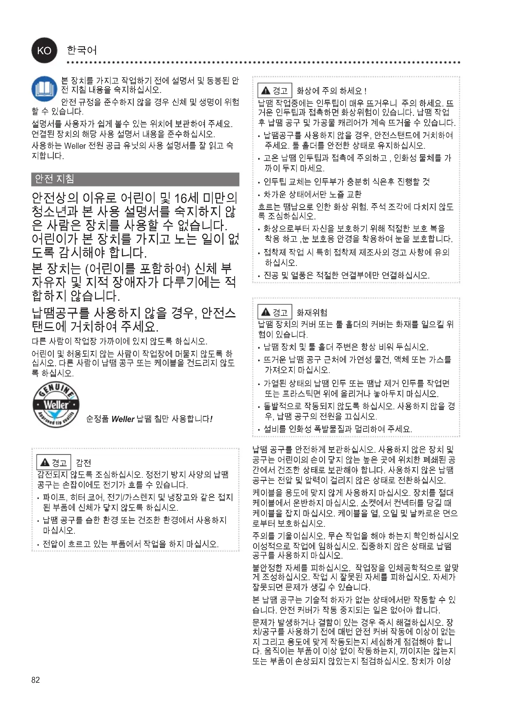 사용 설명서에 제시된 납땜 및 납땜 제거 용도에 맞춰 이곳에 제시된 조건 하에서만 납땜인두를 사용하십시오. 납땜인두는 Weller 전원 공급 유닛을 통해서만 작동할 수 있