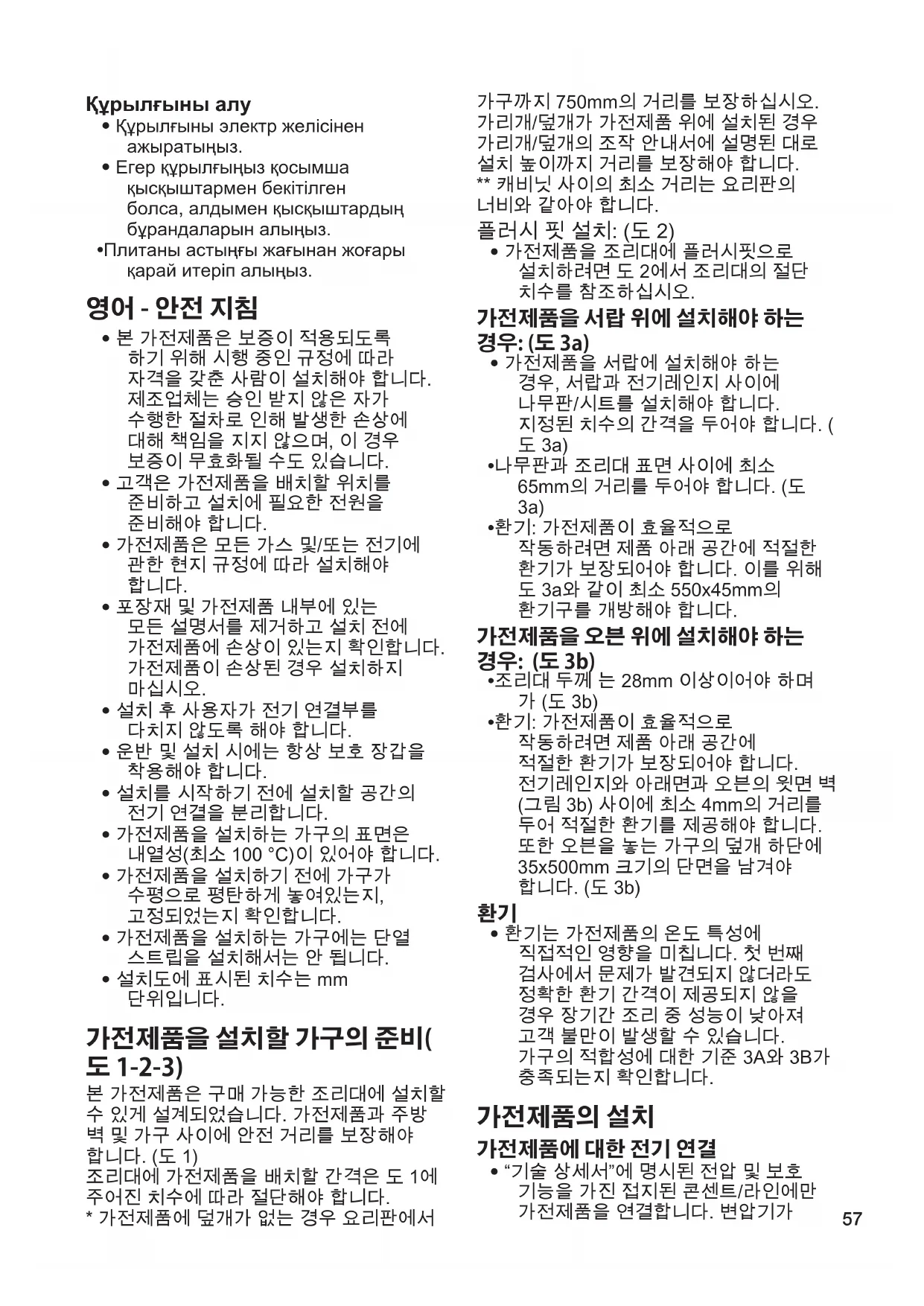 - 가전제품을 서랍에 설치해야 하는 경우, 서랍과 전기레인지 사이에 나무판/시트를 설치해야 합니다. 지정된 치수의 간격을 두어야 합니다. ( 도 3a)
