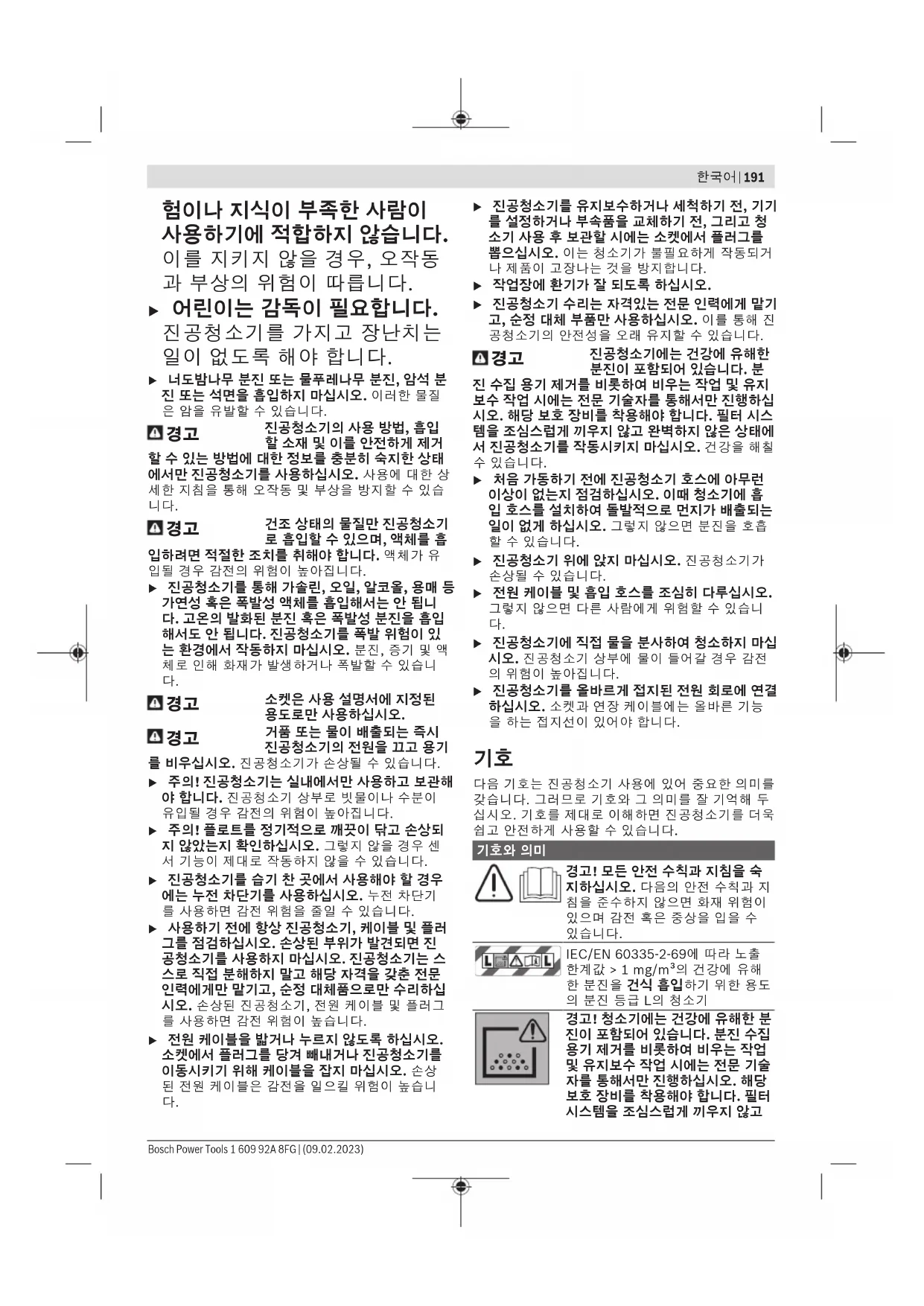 한계값 >1mg/m³의 건강에 유해 한 분진을 건식 흡입하기 위한 용도 의 분진 등급L의 청소기 경고! 청소기에는 건강에 유해한 분 진이 포함되어 있습니다. 분진 수집 용기 제거를 비롯하여 비우는 작업 및 유지보수 작업 시에는 전문 기술 자를 통해서만 진행하십시오. 해당 보호 장비를 착용해야 합니다. 필터 시스템을 조심스럽게 끼우지 않고 Bosch Power Tools 1 609 92A 8FG | (09.02.2023)192 | 한국어