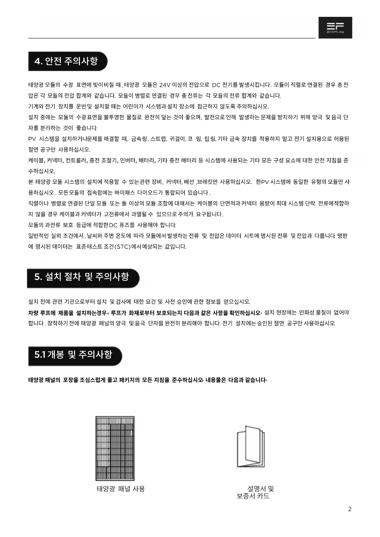 케이블, 커넥터, 컨트롤러, 충전 조절기, 인버터, 배터리, 기타 충전 배터리 등 시스템에 사용되는 기타 모든 구성 요소에 대한 안전 지침을 준