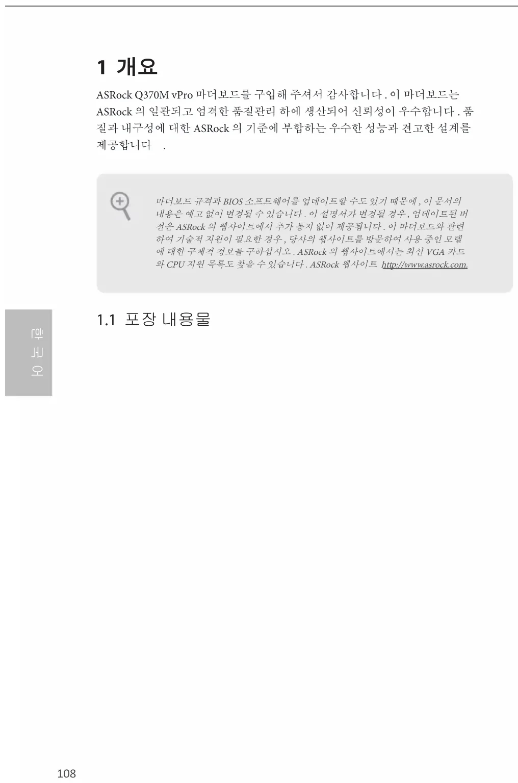 1 개요 ASRock Q370M vPro 마더보드를 구입해 주셔서 감사합니다 . 이 마더보드는 ASRock 의 일관되고 엄격한 품질관리 하에 생산되어 신뢰성이 우수합니다 . 품 질과 내구성에 대한 ASRock 의 기준에 부합하는 우수한 성능과 견고한 설계를