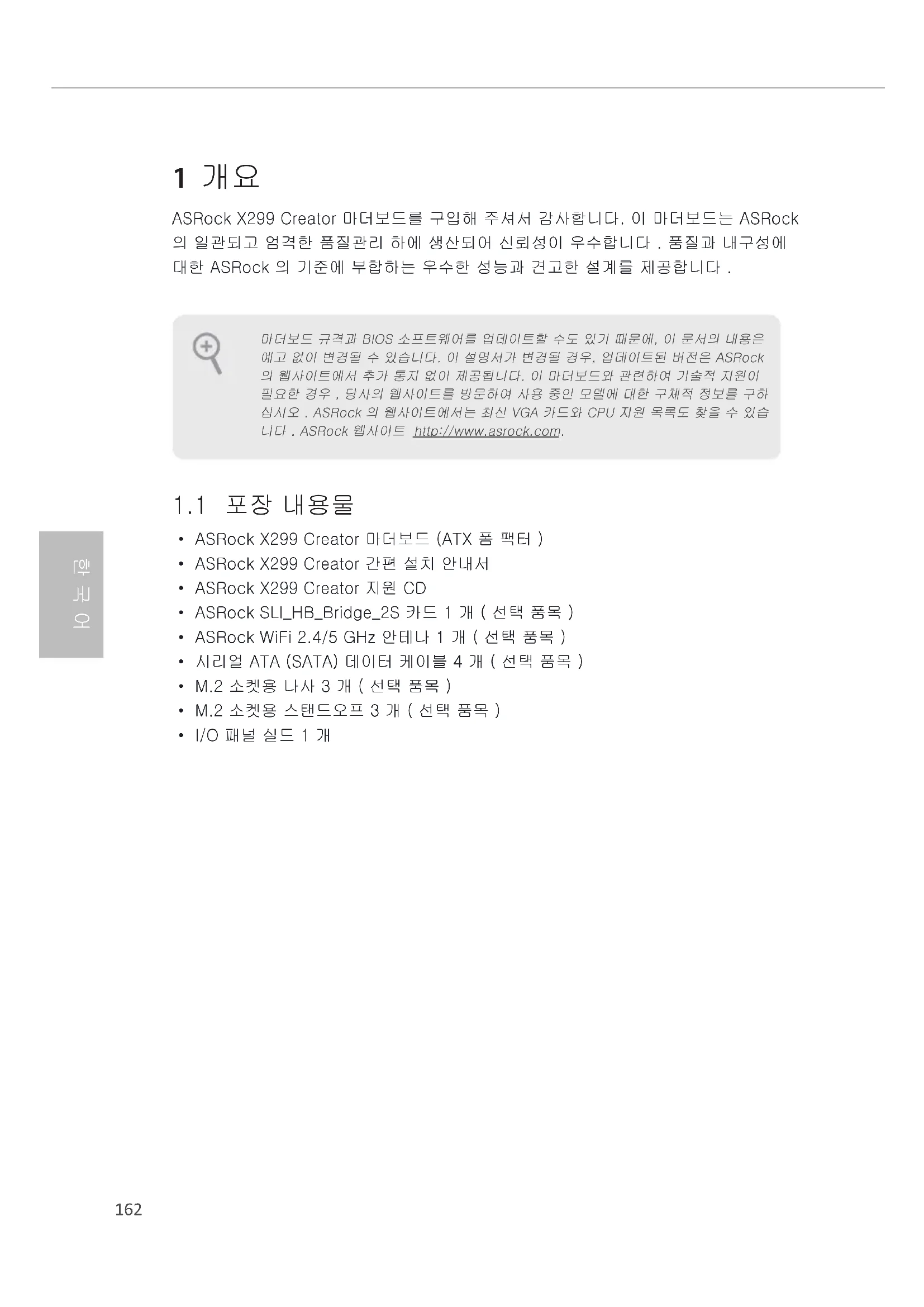 - I/O 패널 실드 1 개 마더보드 규격과 BIOS 소프트웨어를 업데이트할 수도 있기 때문에, 이 문서의 내용은 예고 없이 변경될 수 있습니다. 이 설명서가 변경될 경우, 업데이트된 버전은 ASRock의 웹사이트에서 추가 통지 없이 제공됩니다. 이 마더보드와 관련하여 기술적 지원이 필요한 경우 , 당사의 웹사이트를 방문하여 사용 중인 모델에 대한 구체적 정보를 구하십시오 . ASRock 의 웹사이트에서는 최신 VGA 카드와 CPU 지원 목록도 찾을 수 있습니다 . ASRock 웹사이트 http://www.asrock.com.163 X299 Creator