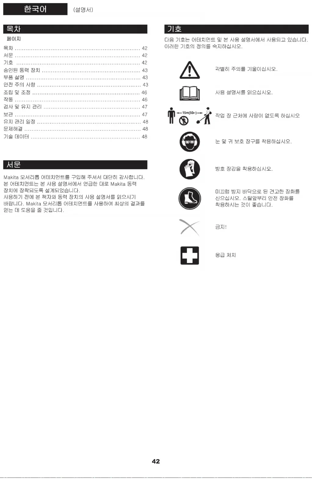 Makita 모서리톱 어테치먼트를 구입해 주셔서 대단히 감사합니다. 본 어테치먼트는 본 사용 설명서에서 언급한 대로 Makita 동력 장치에 장착되도록 설계되었습니다. 사용하기 전에 본 책자와 동력 장치의 사용 설명서를 읽으시기 바랍니다. Makita 모서리톱 어테치먼트를 사용하여 최상의 결과를 얻는 데 도움을 줄 것입니다.