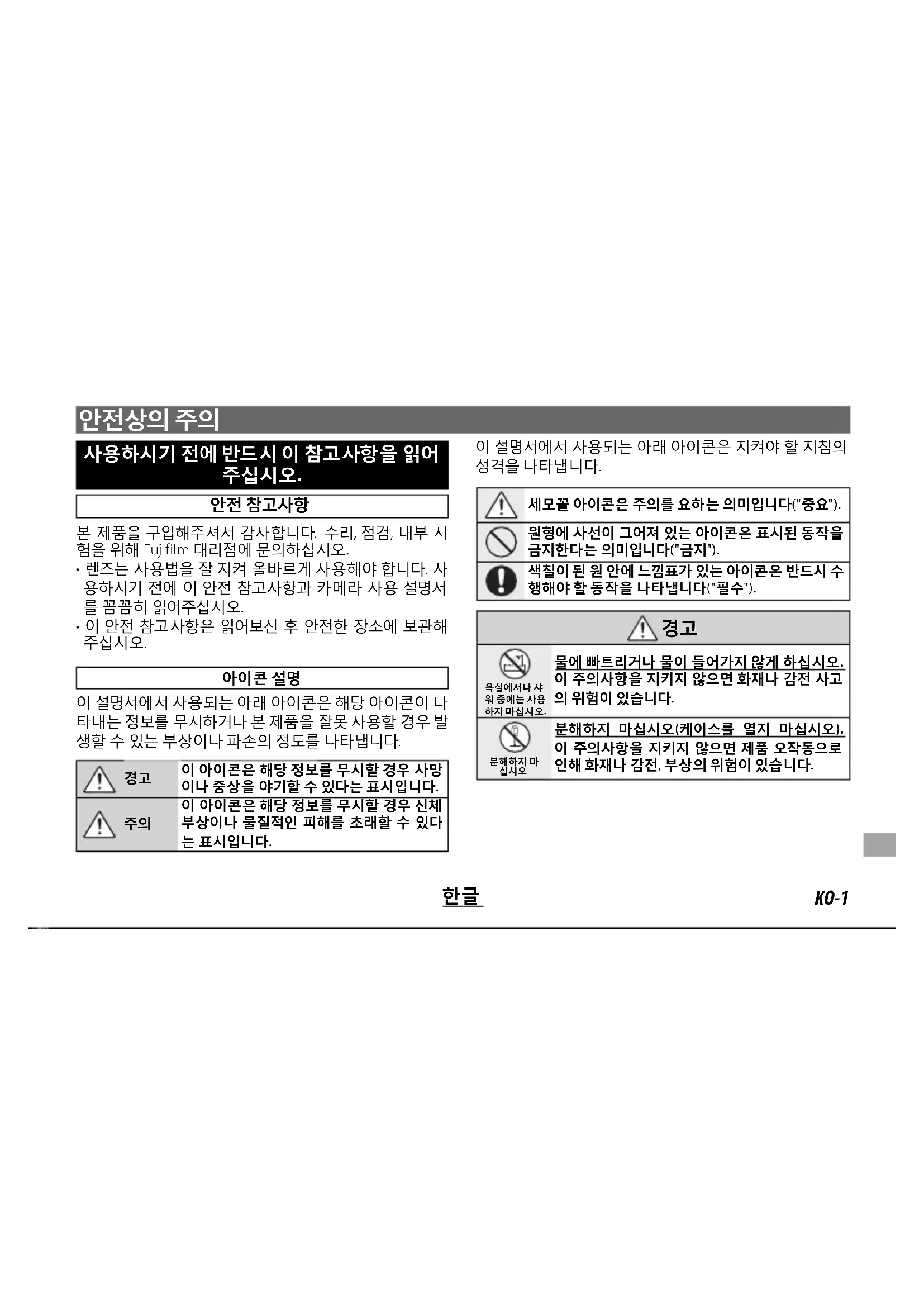 - 렌즈는 사용법을 잘 지켜 올바르게 사용해야 합니다. 사 용하시기 전에 이 안전 참고사항과 카메라 사용 설명서 를 꼼꼼히 읽어주십시오.