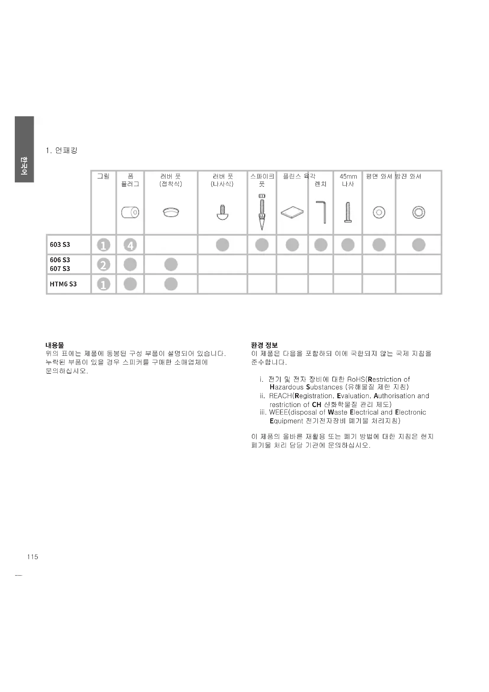 위의 표에는 제품에 동봉된 구성 부품이 설명되어 있습니다. 누락된 부품이 있을 경우 스피커를 구매한 소매업체에