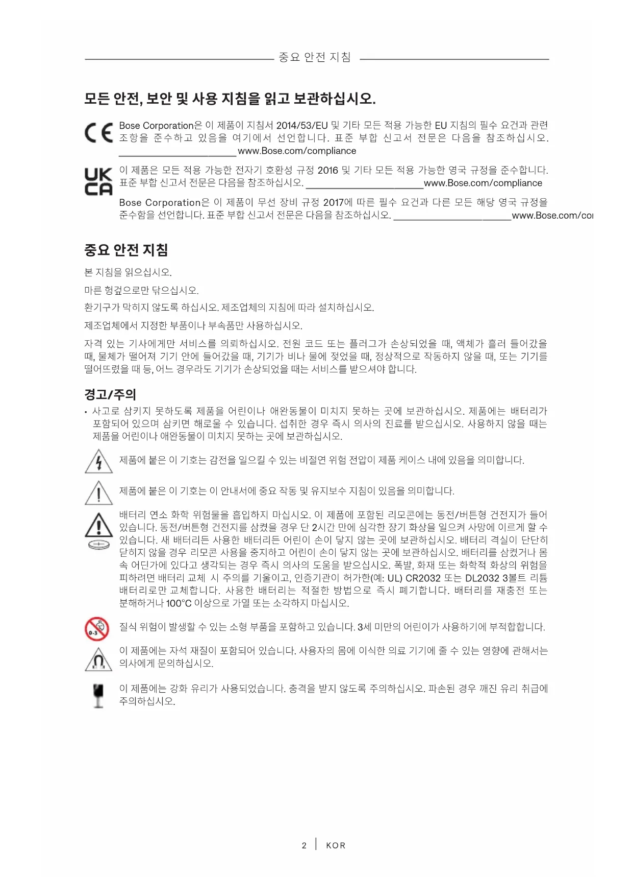 KOR 모든 안전, 보안 및 사용 지침을 읽고 보관하십시오. Bose Corporation은 이 제품이 지침서 2014/53/EU 및 기타 모든 적용 가능한 EU 지침의 필수 요건과 관련 조항을 준수하고 있음을 여기에서 선언합니다. 표준 부합 신고서 전문은 다음을 참조하십시오. www.Bose.com/compliancewww.Bose.com/compliance 이 제품은 모든 적용 가능한 전자기 호환성 규정 2016 및 기타 모든 적용 가능한 영국 규정을 준수합니다. 표준 부합 신고서 전문은 다음을 참조하십시오. www.Bose.com/compliancewww.Bose.com/compliance Bose Corporation은 이 제품이 무선 장비 규정 2017에 따른 필수 요건과 다른 모든 해당 영국 규정을 준수함을 선언합니다. 표준 부합 신고서 전문은 다음을 참조하십시오. www.Bose.com/compliancewww.Bose.com/compliance
