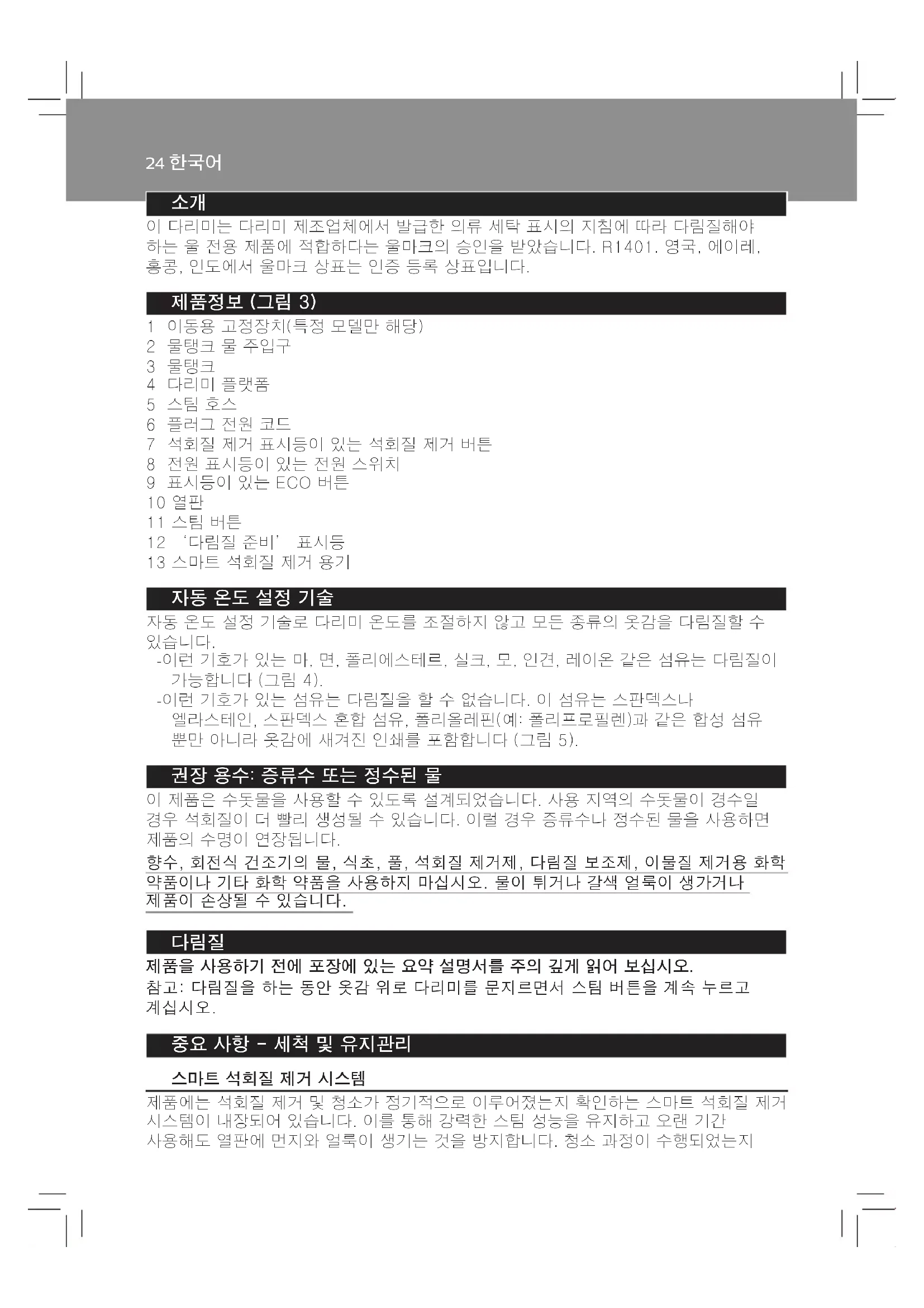 이 다리미는 다리미 제조업체에서 발급한 의류 세탁 표시의 지침에 따라 다림질해야 하는 울 전용 제품에 적합하다는 울마크의 승인을 받았습니다. R1401. 영국, 에이레, 홍콩, 인도에서 울마크 상표는 인증 등록 상표입니다. 제품정보 (그림 3) 1 이동용 고정장치(특정 모델만 해당) 2 물탱크 물 주입구 3 물탱크 4 다리미 플랫폼 5 스팀 호스 6 플러그 전원 코드 7 석회질 제거 표시등이 있는 석회질 제거 버튼 8 전원 표시등이 있는 전원 스위치 9 표시등이 있는 ECO 버튼 10 열판 11 스팀 버튼 12 ‘다림질 준비’ 표시등 13 스마트 석회질 제거 용기 자동 온도 설정 기술 자동 온도 설정 기술로 다리미 온도를 조절하지 않고 모든 종류의 옷감을 다림질할 수