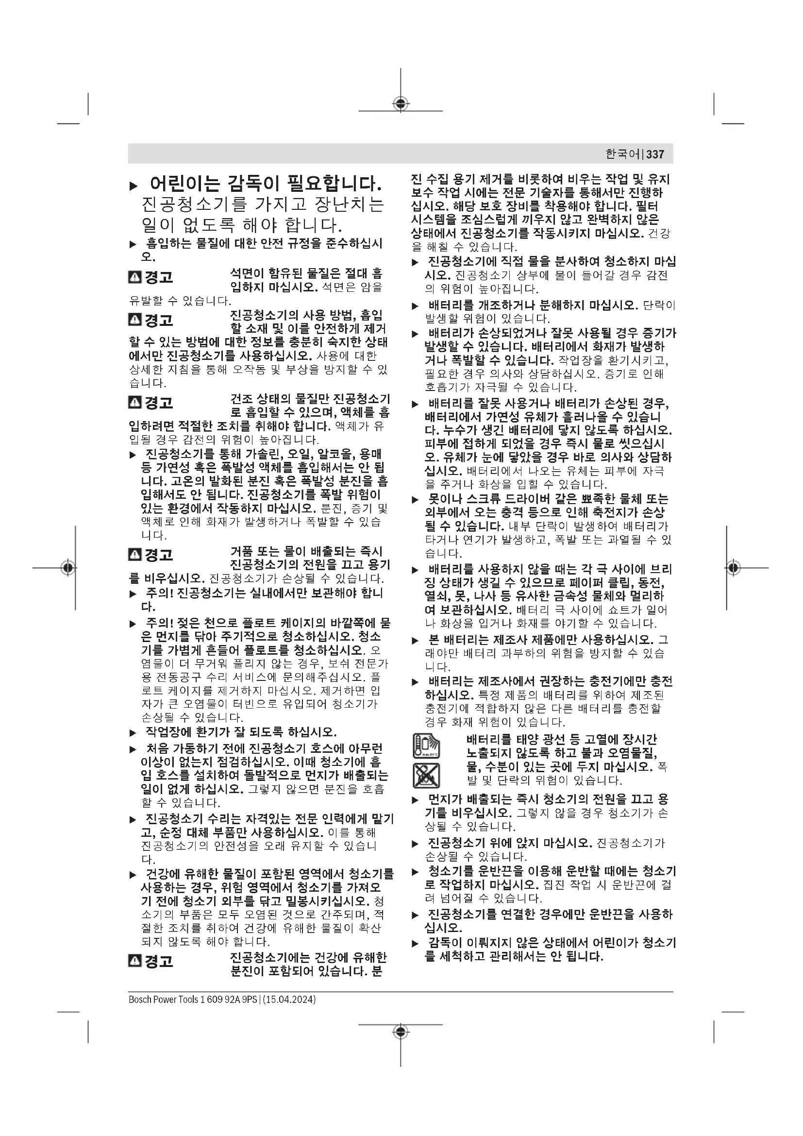 1 609 92A 9PS | (15.04.2024) Bosch Power Tools한국어 | 337 u 어린이는 감독이 필요합니다. 진공청소기를 가지고 장난치는 일이 없도록 해야 합니다. u 흡입하는 물질에 대한 안전 규정을 준수하십시