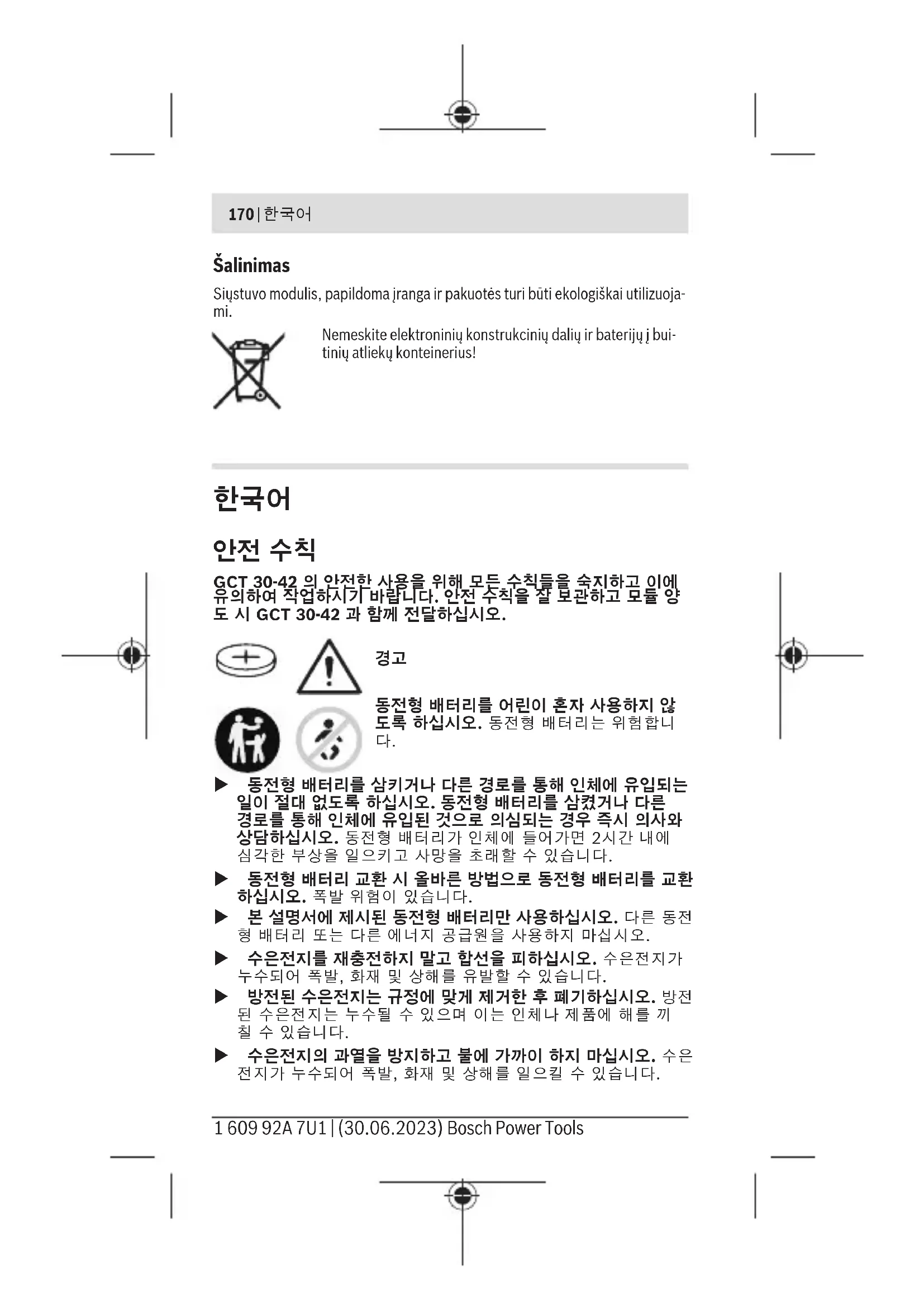 u 동전형 배터리를 삼키거나 다른 경로를 통해 인체에 유입되는 일이 절대 없도록 하십시오. 동전형 배터리를 삼켰거나 다른경로를 통해 인체에 유입된 것으로 의심되는 경우 즉시 의사와상담하십시오. 동전형 배터리가 인체에 들어가면 2시간 내에심각한 부상을 일으키고 사망을 초래할 수 있습니다. u 동전형 배터리 교환 시 올바른 방법으로 동전형 배터리를 교환 하십시오. 폭발 위험이 있습니다. u 본 설명서에 제시된 동전형 배터리만 사용하십시오. 다른 동전 형 배터리 또는 다른 에너지 공급원을 사용하지 마십시오. u 수은전지를 재충전하지 말고 합선을 피하십시오. 수은전지가 누수되어 폭발, 화재 및 상해를 유발할 수 있습니다. u 방전된 수은전지는 규정에 맞게 제거한 후 폐기하십시오. 방전 된 수은전지는 누수될 수 있으며 이는 인체나 제품에 해를 끼칠 수 있습니다. u 수은전지의 과열을 방지하고 불에 가까이 하지 마십시오. 수은 전지가 누수되어 폭발, 화재 및 상해를 일으킬 수 있습니다. 1 609 92A 7U1 | (30.06.2023) Bosch Power Tools한국어 | 171 u 수은전지를 손상시키거나 분리하지 마십시오. 수은전지가 누 수되어 폭발, 화재 및 상해를 일으킬 수 있습니다. u 손상된 수은전지에 물이 닿지 않도록 하십시오. 리튬이 누수되 어 화재 또는 폭발이 일어나거나 이로 인하여 부상을 입을 수있습니다. u 해당 무선설비는 전파혼신 가능성이 있으므로 인명안전 과 관 련된 서비스는 할 수 없습니다 . ® 워드마크와 그림(로고)은 Bluetooth SIG, Inc.의 등록상표입니다. Robert Bosch Power Tools GmbH는 허가를 받아이를 사용하고 있습니다.충전 공구가 작동되는 부위(예: 손잡이 표면, 스위치, 표시기)에 송신기 모듈을 부착하지 마십시오.