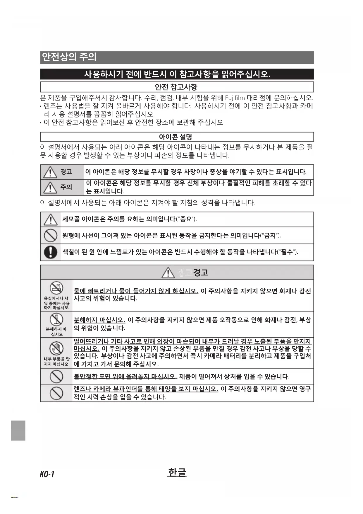 떨어뜨리거나 기타 사고로 인해 외장이 파손되어 내부가 드러날 경우 노출된 부품을 만지지 마십시오. 이 주의사항을 지키지 않고 손상된 부품을 만질 경우 감전 사고나 부상을 당할 수 있습니다. 부상이나 감전 사고에 주의하면서 즉시 카메라 배터리를 분리하고 제품을 구입처 에 가지고 가서 문의해 주십시오. 불안정한 표면 위에 올려놓지 마십시오. 제품이 떨어져서 상처를 입을 수 있습니다. 렌즈나 카메라 뷰파인더를 통해 태양을 보지 마십시오. 이 주의사항을 지키지 않으면 영구 적인 시력 손상을 입을 수 있습니다.KO-2