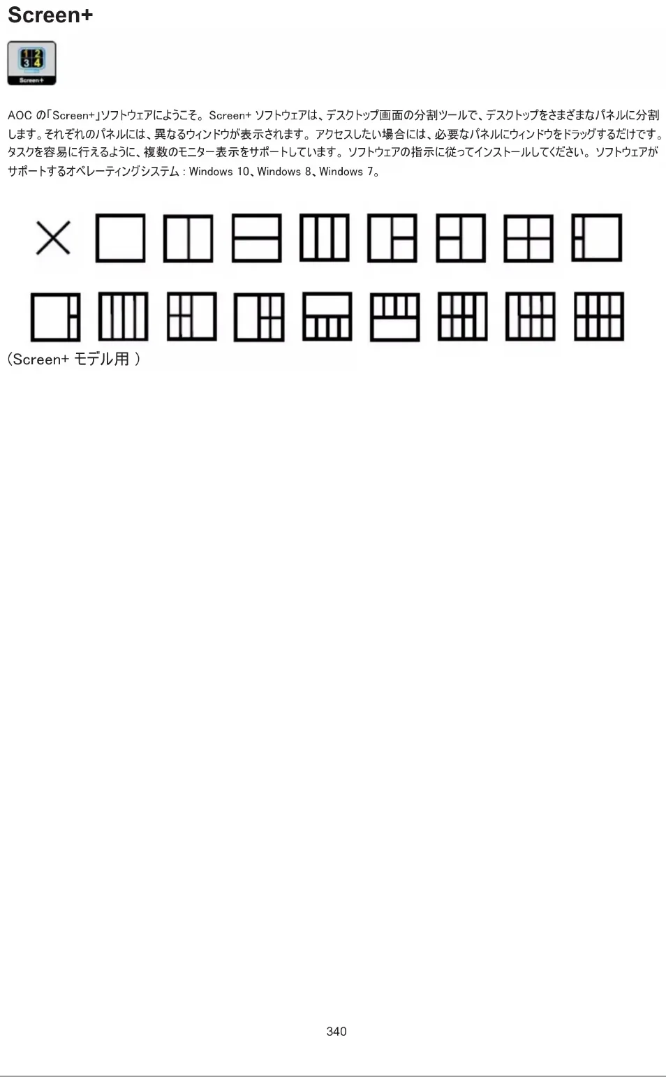 모든 모델에서 기능을 사용할 수 없습니다 . (G-Menu 모델의 경우 )359 e-Saver AOC e-Saver 모니터 전원 관리 소프트웨어 사용을 환영합니다 ! AOC e-Saver 에는 스마트 시스템 종료 기능이 있어 PC 가 어떠한 상태에 (On( 켜짐 ), Off( 꺼짐 ), Sleep/Standby mode( 취침 / 대기 모드 ) 또는 , Screen Saver( 화면 보호기 )) 에 있든 모니터를 시의 적절하게 끌 수 있습니다 . 실제 끄기 시간은 사용자의 기본 설정에 따라 다릅니다 ( 아래의 예 참조 ). “driver/e-Saver/setup.exe”를 클릭하여 e-Saver 소프트웨어 설치를 시작하고 설치 마법사를 따라 소프트웨어 설치를 완료하십시오 . 네 가지 PC 상태 각각의 풀다운 메뉴에서 모니터가 자동으로 꺼지는 시간 ( 단위 : 분 ) 을 원하는 대로 선택할 수 있습니다 . 그림으로 예시된 위의 예를 참조하십시오 . 1). PC 가 켜진 상태에서는 모니터가 꺼지지 않습니다 . 2). PC 를 끄면 5 분 후에 모니터가 자동으로 꺼집니다 . 3). PC 가 슬립 / 대기 모드로 전환되면 10 분 후에 모니터가 자동으로 꺼집니다 . 4). 화면 보호기가 표시된 후 20 분이 지나면 모니터가 자동으로 꺼집니다 . “RESET( 초기화 )”를 클릭하여 e-Saver 를 아래와 같이 초기 설정값으로 설정할 수 있습니다 . (e-Saver 모델의 경우 )360 Screen+ AOC 의 “Screen+” 소프트웨어에 오신 것을 환영합니다 . Screen+ 소프트웨어는 바탕화면 분할 도구로서 , 바탕화면을 여러 개의 다른 패널로 분할하고 각 패널에서는 다른 창을 표시합니다 . 패널에 액세스하려는 경우 창을 해당 패널로 끌어 가기만 하면 됩니다 . 이로써 여러 모니터 디스플레이를 지원하여 작업이 수월해집니다 . 설치 소프트웨어에 따라 설치하십시오 . 소프트웨어가 지원하는 운영 체제 : Windows 10, Windows 8,Windows 7. (Screen+ 모델의 경우 )361 Regulacja(Polish) Ustawianie optymalnej rozdzielczości Windows 10 Dla Windows 10