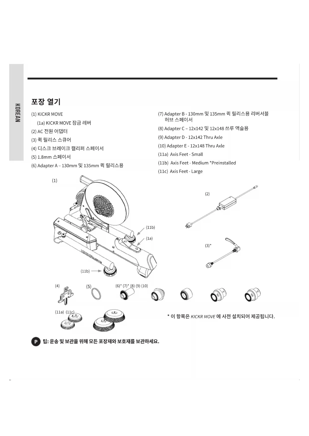 경고* 이 항목은 KICKR MOVE 에 사전 설치되어 제공됩니다. 팁:운송및보관을위해모든포장재와보호재를보관하세요.