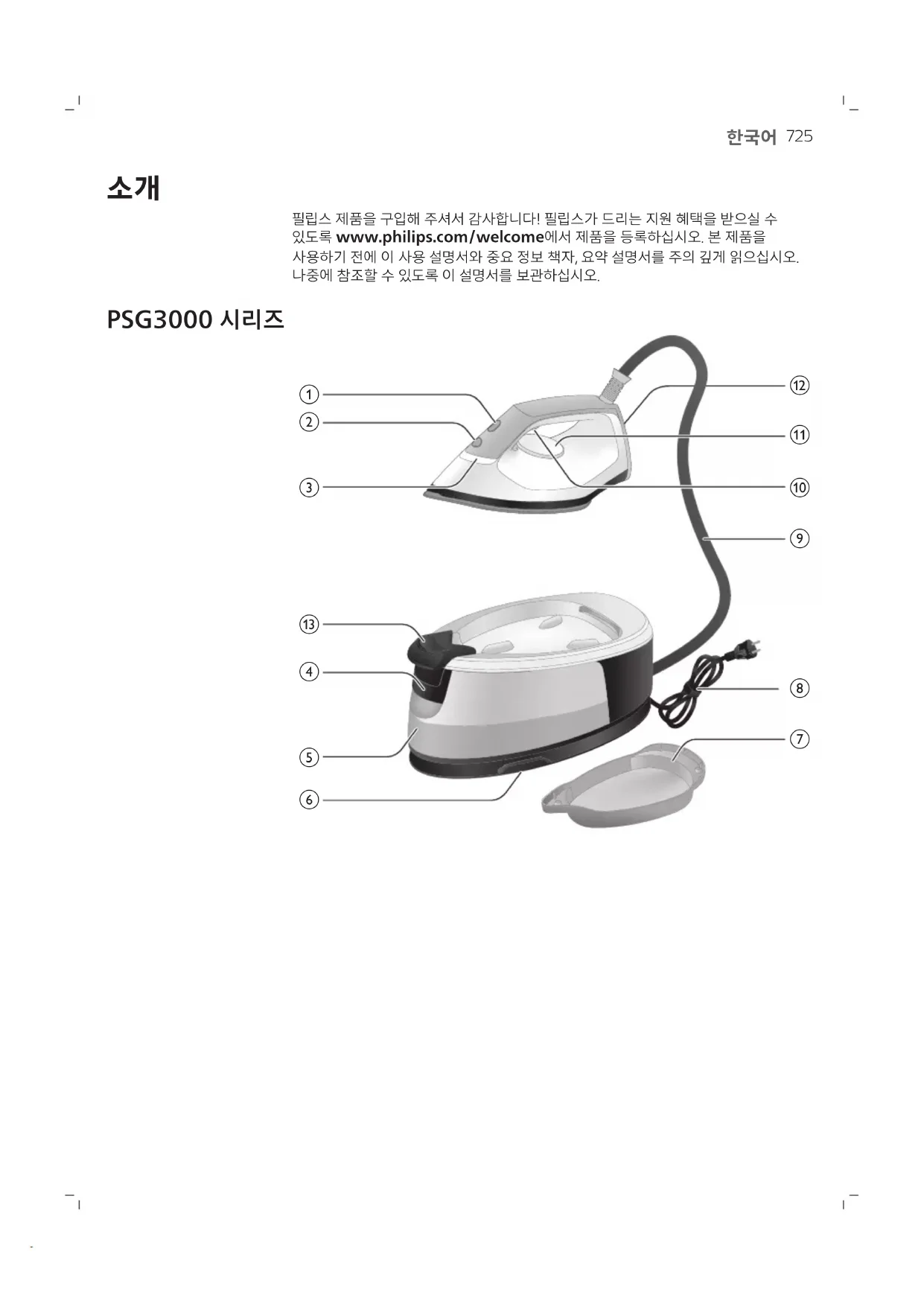 필립스 제품을 구입해 주셔서 감사합니다! 필립스가 드리는 지원 혜택을 받으실 수있도록 www.philips.com/welcome에서 제품을 등록하십시오. 본 제품을사용하기 전에 이 사용 설명서와 중요 정보 책자, 요약 설명서를 주의 깊게 읽으십시오.나중에 참조할 수 있도록 이 설명서를 보관하십시오. PSG3000 시리즈