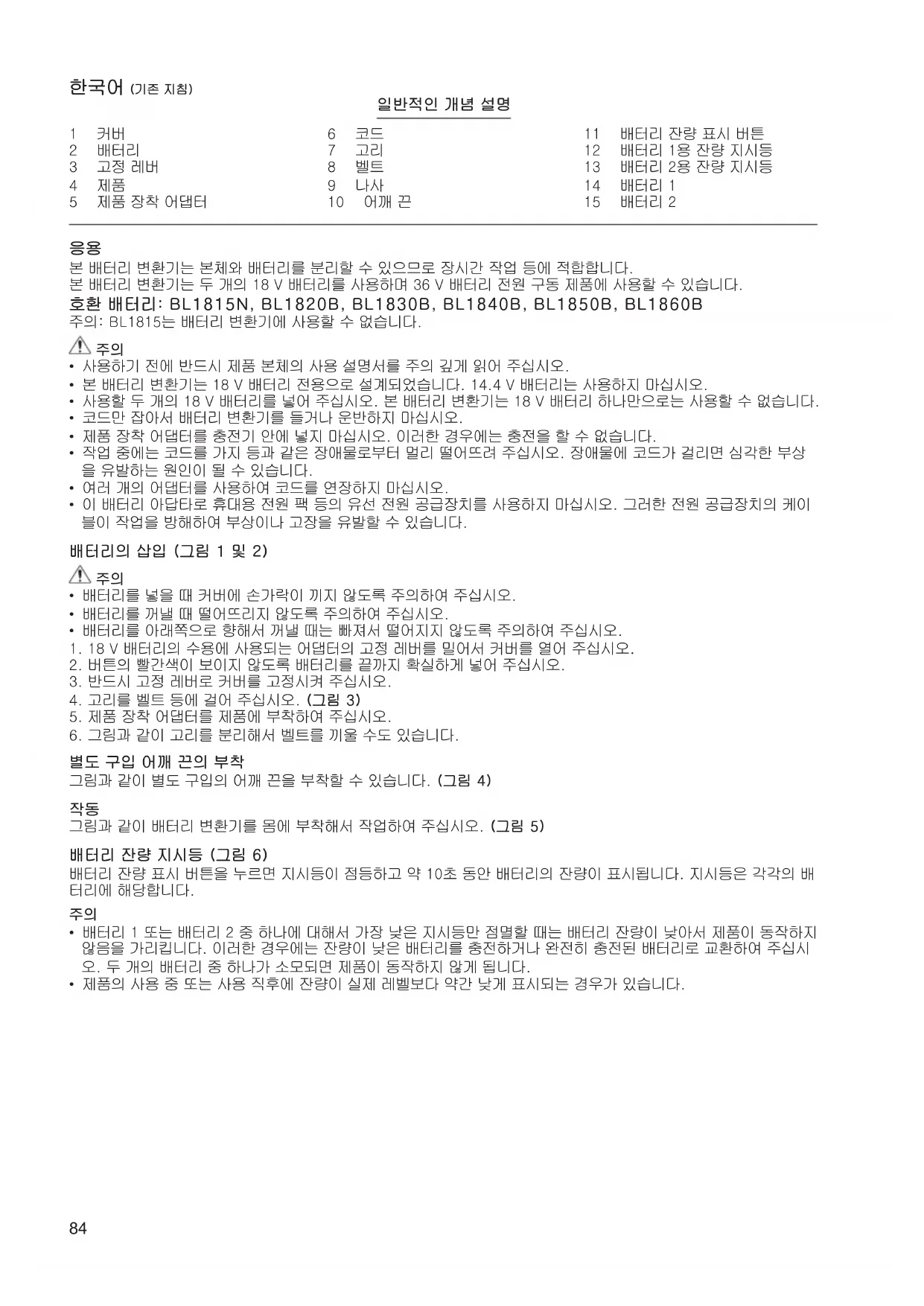 본배터리변환기는본체와배터리를분리할수있으므로장시간작업등에적합합니다. 본배터리변환기는두개의18V배터리를사용하며36V배터리전원구동제품에사용할수있습니다. 호환 배터리: BL1815N, BL1820B, BL1830B, BL1840B, BL1850B, BL1860B 주의:BL1815는배터리변환기에사용할수없습니다.