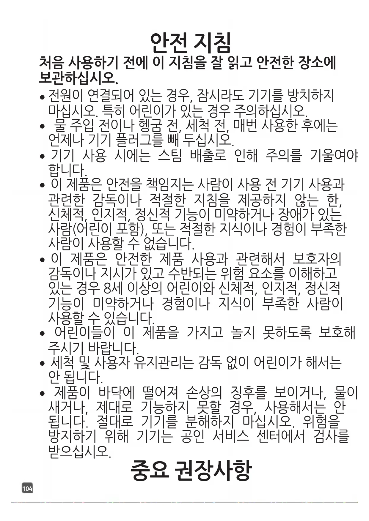 - 뜨거운 부품, 뜨거운 물 또는 스팀에 닿아 화상을 입을 수 있습니다. 스팀 제품을106 비울 때에는 주의를 기울여야 하고, 물 탱크 안, 또는 기기 내부에 뜨거운 물이 있으니 주의해 주십시오.
