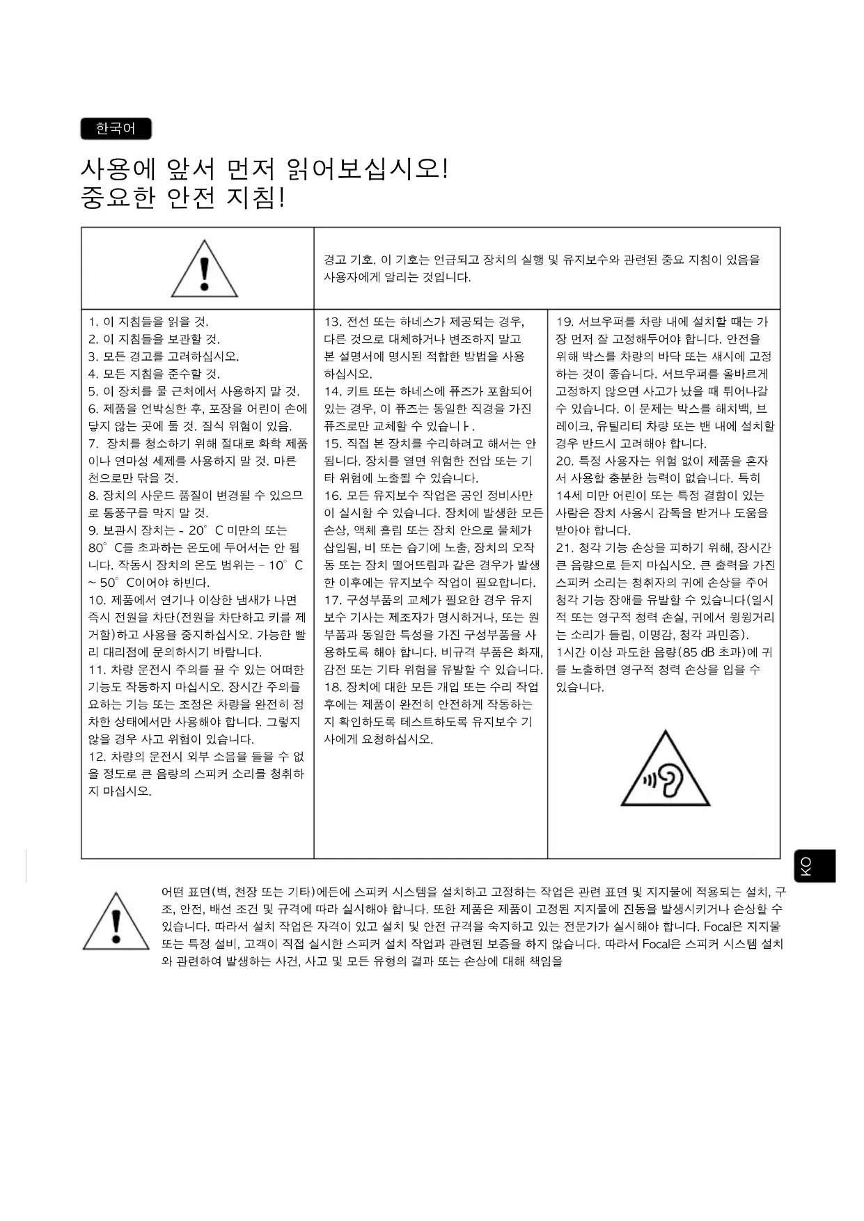 如有疑问,请联系Focal经销商。 在法国购买的任何Focal产品享受自购买之日起2年的法定质保期。如设备不合格,您需使用原包装或同类型包装以便在运输过程中提供妥 善保护,将其寄送至经销商处,由经销商对产品进行检测并排查故障原因。如设备在质保期内且符合质保条件,我们将依据产品购买时的 法定质保条款对其进行维修或更换。反之,我们将为您出具维修费用明细。不当使用或错误连接(如移动线圈烧毁等)导致的损坏不在质 保范围内。在法国以外地区,Focal产品所享受的质保条款由各自国家的Focal官方授权经销商根据当地现行法律制定并实施。 要方便获得Focal-JMlab产品的质保, 您现在可以在线注册产品:www.focal.com/warranty어떤 표면(벽, 천장 또는 기타)에든에 스피커 시스템을 설치하고 고정하는 작업은 관련 표면 및 지지물에 적용되는 설치, 구 조, 안전, 배선 조건 및 규격에 따라 실시해야 합니다. 또한 제품은 제품이 고정된 지지물에 진동을 발생시키거나 손상할 수 있습니다. 따라서 설치 작업은 자격이 있고 설치 및 안전 규격을 숙지하고 있는 전문가가 실시해야 합니다. Focal은 지지물 또는 특정 설비, 고객이 직접 실시한 스피커 설치 작업과 관련된 보증을 하지 않습니다. 따라서 Focal은 스피커 시스템 설치 와 관련하여 발생하는 사건, 사고 및 모든 유형의 결과 또는 손상에 대해 책임을 경고 기호. 이 기호는 언급되고 장치의 실행 및 유지보수와 관련된 중요 지침이 있음을 사용자에게 알리는 것입니다.