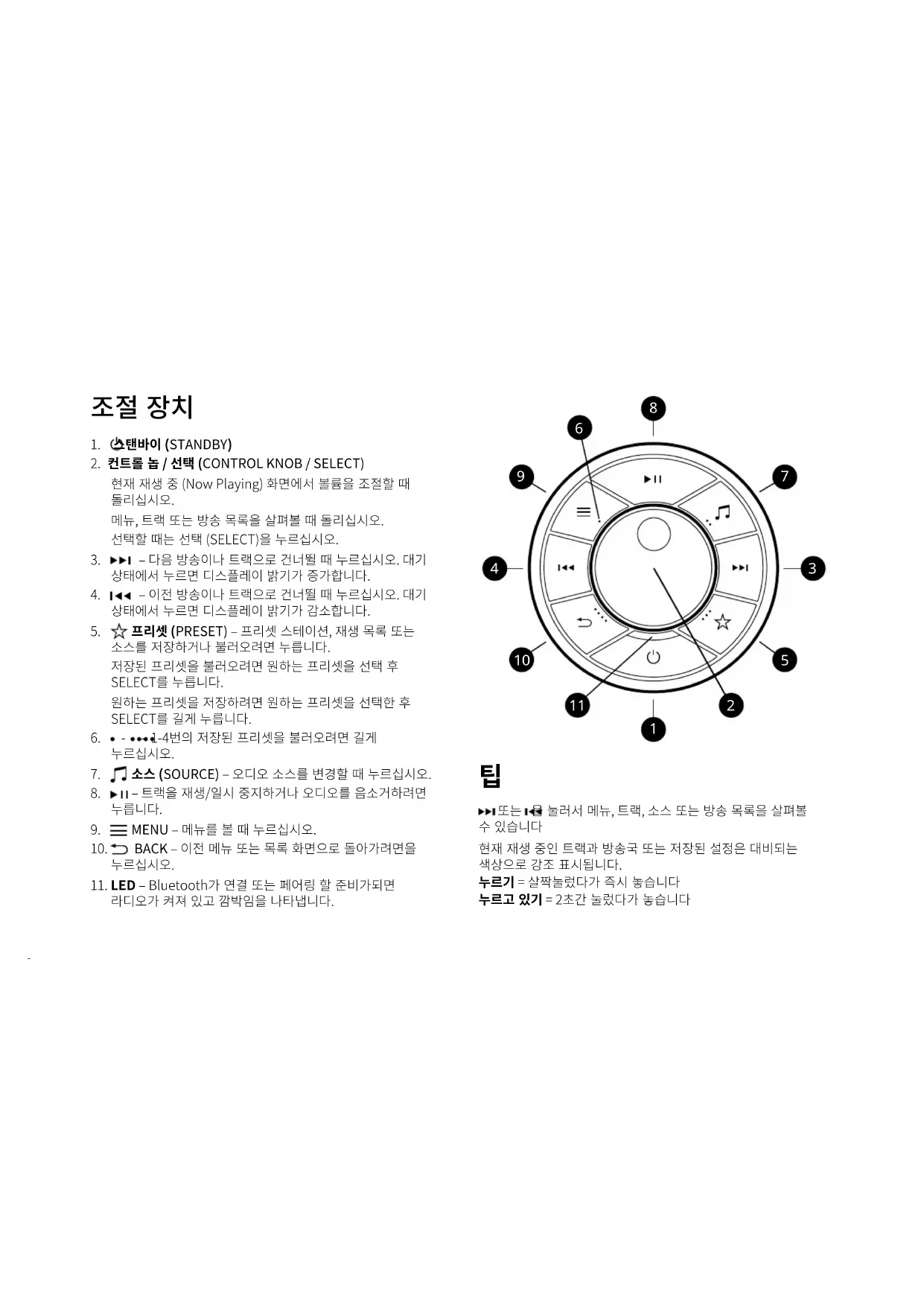 PRESET)–프리셋 스테이션,재생 목록 또는 소스를 저장하거나 불러오려면 누릅니다. 저장된 프리셋을 불러오려면 원하는 프리셋을 선택 후 SELECT를 누릅니다. 원하는 프리셋을 저장하려면 원하는 프리셋을 선택한 후 SELECT를 길게 누릅니다.