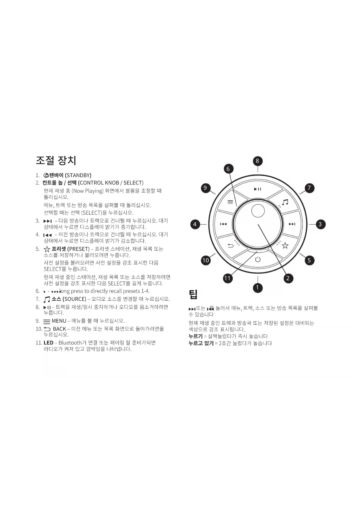–다음 방송이나 트랙으로 건너뛸 때 누르십시오.대기 상태에서 누르면 디스플레이 밝기가 증가합니다.