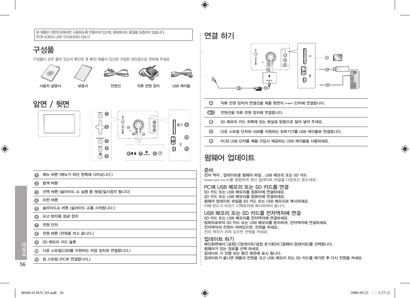 BN68-01567C-03.indb 55 2008-09-23 5:27:10 본 제품은 대한민국에서만 사용하도록 만들어져 있으며, 해외에서는 품질을 보증하지 않습니다. (FOR KOREA UNIT STANDARD ONLY)