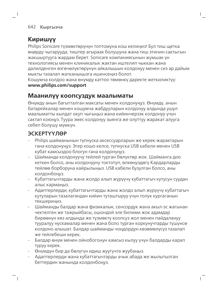 Philips шайманынын түпнуска аксессуарларын же керек-жарактарын гана колдонуңуз. Эгер кошо келсе, түпнуска USB кабели менен USB кубат камсыздоо блогун гана колдонуңуз. Шайманда колдонуучу тейлей турган бөлүктөр жок. Шайманга доо кеткен болсо, аны колдонууну токтотуп, өлкөңүздөгү Кардарларды тейлөө борборуна кайрылыңыз. USB кабели бузулган болсо, аны колдонбоңуз. Кубаттагычтарды жана жолдо алып жүрүүчү кубаттагыч кутусун суудан алыс кармаңыз. Адаптерлерди, кубаттагычтарды жана жолдо алып жүрүүчү кубаттагыч кутуларын тазалагандан кийин туташтыруу үчүн толук кургаганын текшериңиз. Шайманды балдар жана физикалык, сенсордук жана акыл-эс жагынан чектелген же тажрыйбасы, ошондой эле билими жок адамдар бирөөнүн көз алдында же түзмөктү коопсуз жол менен пайдалануу тууралуу нускамалар менен жана боло турган коркунучтарды түшүнсө колдоно алышат. Балдар шайманды чоңдордун көзөмөлүсүз тазалап же тейлебеши керек. Балдар өнүм менен ойнобогонун камсыз кылуу үчүн балдарды карап туруу керек. Өнүмдүн бир да бөлүгүн идиш жуугучта жуубаңыз. Адаптерлерди жана кубаттагычтарды ачык абада же жылытылган беттердин жанында колдонбоңуз.