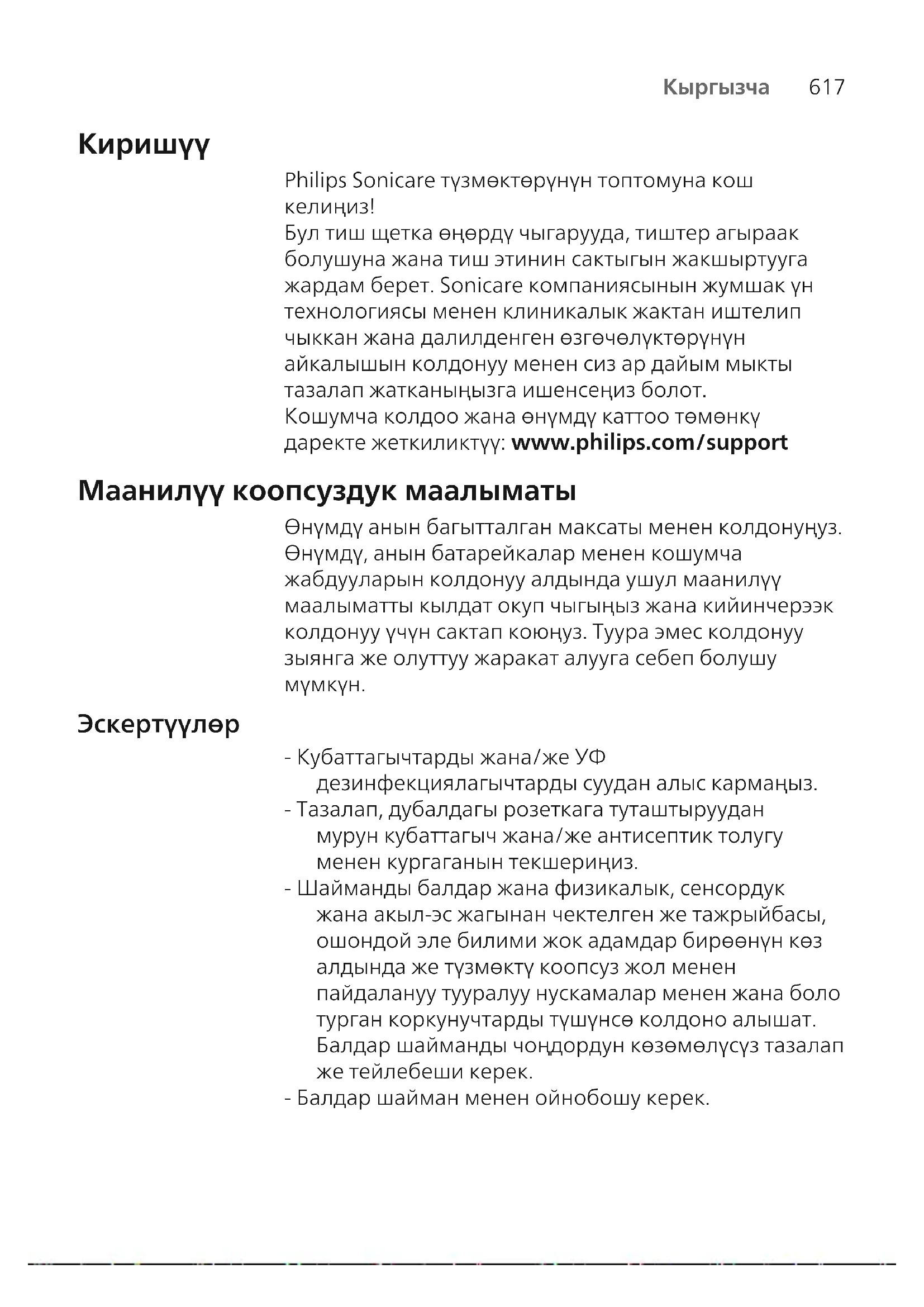 Эскертүүлөр - Кубаттагычтарды жана/же УФ дезинфекциялагычтарды суудан алыс кармаңыз. - Тазалап, дубалдагы розеткага туташтыруудан мурун кубаттагыч жана/же антисептик толугу менен кургаганын текшериңиз. - Шайманды балдар жана физикалык, сенсордук жана акыл-эс жагынан чектелген же тажрыйбасы, ошондой эле билими жок адамдар бирөөнүн көз алдында же түзмөктү коопсуз жол менен пайдалануу тууралуу нускамалар менен жана боло турган коркунучтарды түшүнсө колдоно алышат. Балдар шайманды чоңдордун көзөмөлүсүз тазалап же тейлебеши керек. - Балдар шайман менен ойнобошу керек.618