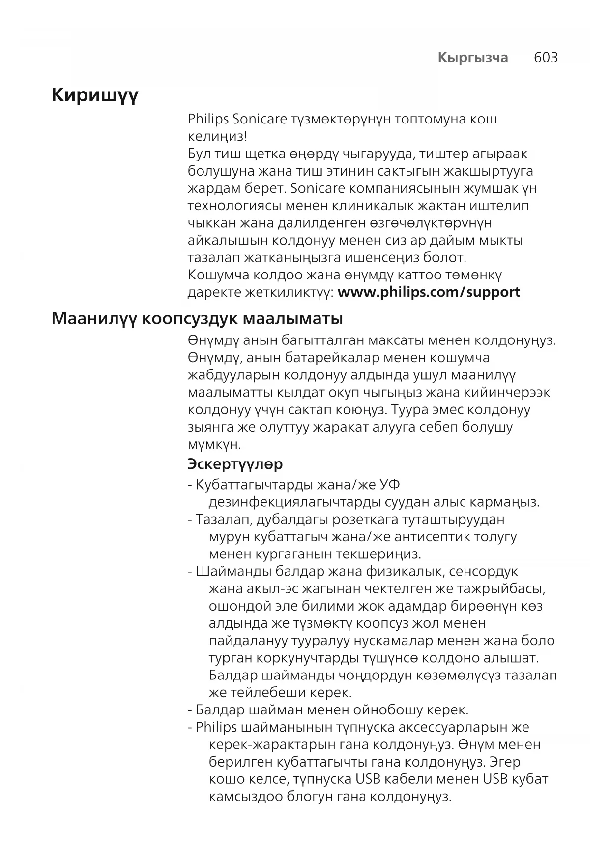 Эскертүүлөр - Кубаттагычтарды жана/же УФ дезинфекциялагычтарды суудан алыс кармаңыз. - Тазалап, дубалдагы розеткага туташтыруудан мурун кубаттагыч жана/же антисептик толугу менен кургаганын текшериңиз. - Шайманды балдар жана физикалык, сенсордук жана акыл-эс жагынан чектелген же тажрыйбасы, ошондой эле билими жок адамдар бирөөнүн көз алдында же түзмөктү коопсуз жол менен пайдалануу тууралуу нускамалар менен жана боло турган коркунучтарды түшүнсө колдоно алышат. Балдар шайманды чоңдордун көзөмөлүсүз тазалап же тейлебеши керек. - Балдар шайман менен ойнобошу керек. - Philips шайманынын түпнуска аксессуарларын же керек-жарактарын гана колдонуңуз. Өнүм менен берилген кубаттагычты гана колдонуңуз. Эгер кошо келсе, түпнуска USB кабели менен USB кубат камсыздоо блогун гана колдонуңуз.604