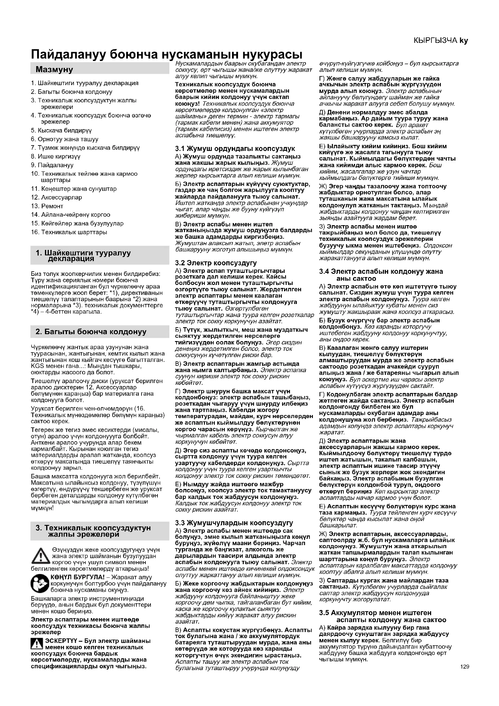 Пайдалануу боюнча нускаманын нукурасы 1. Шайкештиги тууралуу декларация2. Багыты боюнча колдонуу3. Техникалык коопсуздуктун жалпыэрежелери4. Техникалык коопсуздук боюнча өзгөчөэрежелер5. Кыскача билдирүү6. Орнотуу жана ташуу7. Түзмөк жөнүндө кыскача билдирүү8. Ишке киргизүү9. Пайдалануу10. Техникалык тейлөө жана кармоошарттары11. Кеңештер жана сунуштар12. Аксессуарлар13. Ремонт14. Айлана-чөйрөнү коргоо15. Көйгөйлөр жана бузулуулар16. Техникалык шарттарыБиз толук жоопкерчилик менен билдиребиз: Түрү жана сериялык номери боюнча идентификацияланган бул чүркөлөөчү араа төмөнкүлөргө жооп берет: *1), директиванын тиешелүү талаптарынын баарына *2) жана нормаларына *3). техникалык документтерге *4) – 4-беттен карагыла.Чүркөлөөчү жантык араа узунунан жана туурасынан, жантыгынан, кемтик кылып жана жантыгынан кош кыйгач кесүүгө багытталган. KGS менен гана...: Мындан тышкары, оюктарды жасоого да болот.Тиешелүү аралоочу диски (уруксат берилген аралоо дисктерин 12. Аксессуарлар бөлүмүнөн караңыз) бар материалга гана колдонууга болот. Уруксат берилген чен-өлчөмдөрүн (16. Техникалык мүнөздөмөлөр бөлүмүн караңыз) сактоо керек. Тегерек же тегиз эмес кесиктерди (мисалы, отун) аралоо үчүн колдонуууга болбойт. Анткени аралоо учурунда алар бекем кармалбайт. Кырынан коюлган тегиз материалдарды аралап жатканда, коопсуз өткөрүү максатында тиешелүү таянчыкты колдоонуу зарыл. Башка максатта колдонууга жол берилбейт. Максатына ылайыксыз колдонуу, түзүлүшүн өзгөртүү, өндүрүүчү текшербеген же уруксат бербеген деталдарды колдонуу күтүлбөгөн материалдык чыгымдарга алып келиши мүмкүн! Өзүңүздүн жеке коопсуздугуңуз үчүн жана электр шайманын бузулуудан коргоо үчүн ушул символ менен белгиленген көрсөтмөлөрдү аткарыңыз!КӨҢҮЛ БУРГУЛА! – Жаракат алуу коркунучун болтурбоо үчүн пайдалануу боюнча нускаманы окуңуз.Башкаларга электр инструментиңизди берүүдө, анын бардык бул документтери менен кошо бериңиз.Электр аспаптары менен иштөөдө коопсуздук техникасы боюнча жалпы эрежелерЭСКЕРТҮҮ – Бул электр шайманы менен кошо келген техникалык коопсуздук боюнча бардык көрсөтмөлөрдү, нускамаларды жана спецификацияларды окуп чыгыңыз. Нускамалардын баарын окубагандан электр соккусу, өрт чыгышы жана/же олуттуу жаракат алуу келип чыгышы мүмкүн. Техникалык коопсуздук боюнча көрсөтмөлөр менен нускамалардын баарын кийин колдонуу үчүн сактап коюңуз! Техникалык коопсуздук боюнча көрсөтмөлөрдө колдонулган «электр шайманы» деген термин - электр тармагы (тармак кабели менен) жана аккумуятор (тармак кабелисиз) менен иштеген электр аспабына тиешелүү.