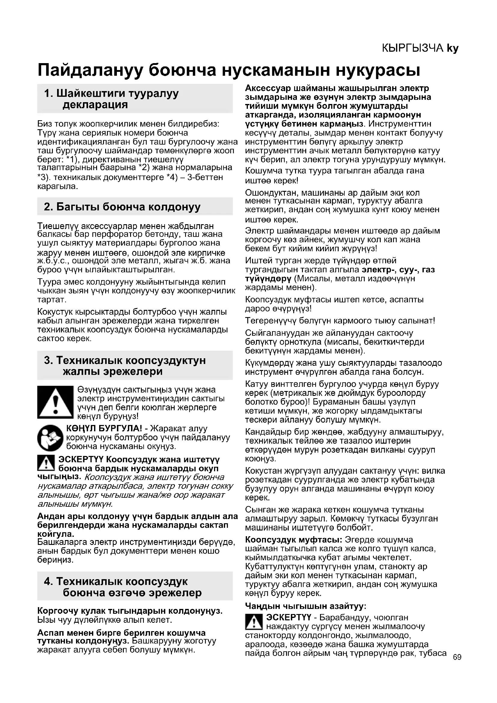 Кокустук кырсыктарды болтурбоо үчүн жалпы кабыл алынган эрежелерди жана тиркелген техникалык коопсуздук боюнча нускамаларды сактоо керек. Өзүңүздүн сактыгыңыз үчүн жана электр инструментиңиздин сактыгы үчүн деп белги коюлган жерлерге көңүл буруңуз! КӨҢҮЛ БУРГУЛА! - Жаракат алуу коркунучун болтурбоо үчүн пайдалануу боюнча нускаманы окуңуз. ЭСКЕРТҮҮ Коопсуздук жана иштетүү боюнча бардык нускамаларды окуп