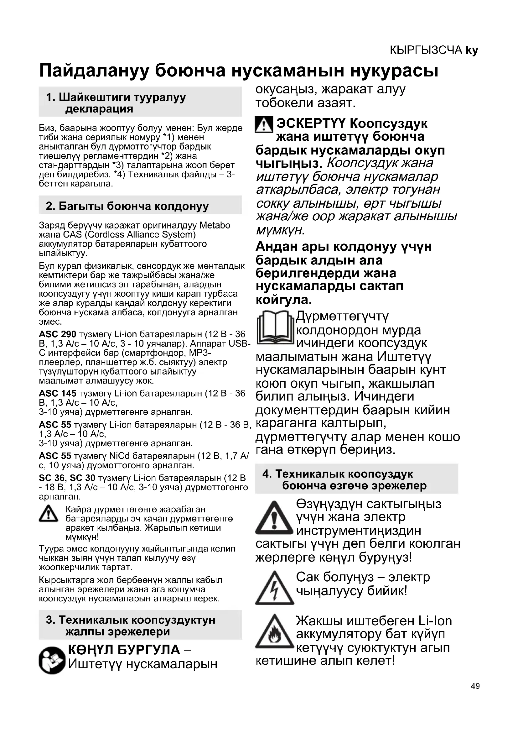 Пайдалануу боюнча нускаманын нукурасы Биз, баарына жооптуу болуу менен: Бул жерде тиби жана сериялык номуру *1) менен аныкталган бул дүрмөттөгүчтөр бардык тиешелүү регламенттердин *2) жана стандарттардын *3) талаптарына жооп берет деп билдиребиз. *4) Техникалык файлды – 3- беттен карагыла. Заряд берүүчү каражат оригиналдуу Metabo жана CAS (Cordless Alliance System) аккумулятор батареяларын кубаттоого