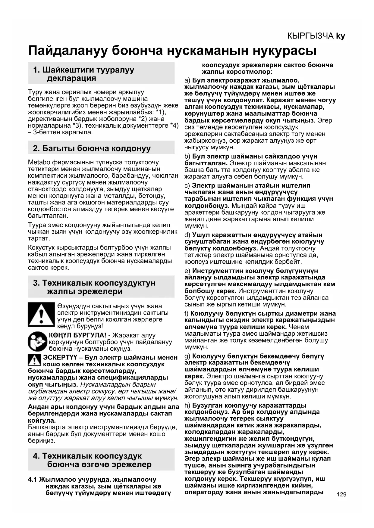 Кокустук кырсыктарды болтурбоо үчүн жалпы кабыл алынган эрежелерди жана тиркелген техникалык коопсуздук боюнча нускамаларды сактоо керек. Өзүңүздүн сактыгыңыз үчүн жана электр инструментиңиздин сактыгы үчүн деп белги коюлган жерлерге көңүл буруңуз! КӨҢҮЛ БУРГУЛА! - Жаракат алуу коркунучун болтурбоо үчүн пайдалануу боюнча нускаманы окуңуз. ЭСКЕРТҮҮ – Бул электр шайманы менен кошо келген техникалык коопсуздук боюнча бардык көрсөтмөлөрдү, нускамаларды жана спецификацияларды окуп чыгыңыз. Нускамалардын баарын окубагандан электр соккусу, өрт чыгышы жана/ же олуттуу жаракат алуу келип чыгышы мүмкүн. Андан ары колдонуу үчүн бардык алдын ала берилгендерди жана нускамаларды сактап