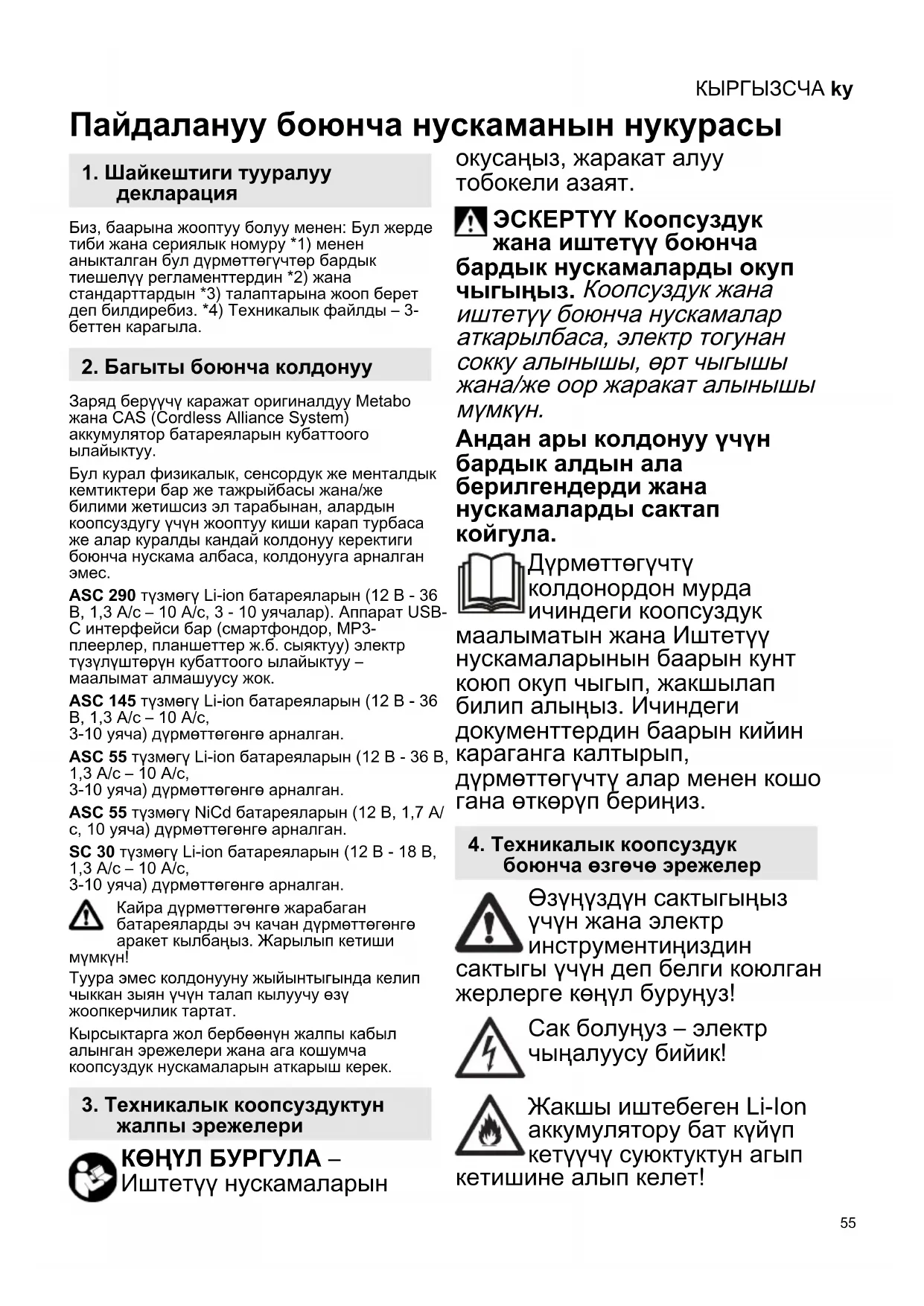 Пайдалануу боюнча нускаманын нукурасы Биз, баарына жооптуу болуу менен: Бул жерде тиби жана сериялык номуру *1) менен аныкталган бул дүрмөттөгүчтөр бардык тиешелүү регламенттердин *2) жана стандарттардын *3) талаптарына жооп берет деп билдиребиз. *4) Техникалык файлды – 3- беттен карагыла. Заряд берүүчү каражат оригиналдуу Metabo жана CAS (Cordless Alliance System) аккумулятор батареяларын кубаттоого