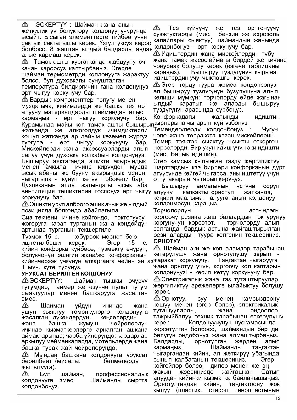 Бардык убакытта сактоо үчүн бул нускамалар менен шаймандын ѳзү маанилүү коопсуздук эскертүүлѳрдү камсыз кылат. Шайман туура эмес колдонгон же туура эмес жѳнгѳ салынган болсо, ѳндүрүүчү бул коопсуздук нускамаларын колдонуу жѳндѳмсүздүгү боюнча жоопкерчиликти четке кагат. ЭСКЕРТҮҮ : Шайман жана анын жеткиликтүү бөлүктөрү колдонуу учурунда ысыйт. Ысыган элементтерге тийбөө үчүн сактык сакталышы керек. Үзгүлтүксүз кароо болбосо, 8 жаштан ылдый балдарды андан алыс кармаш керек. ЭСКЕРТҮҮ : Эгерде конфорканын бети жаракка кеткен болсо, шайманды колдонбогула - токко урунуу коркунучу бар. ЭТИЯТ БОЛУҢУЗ: Өрт чыгуу коркунуч: Нерселерди бышыруу аянттын үстүндө сактабаңыз. АБАЙЛАҢЫЗ: Тамак-ашты даярдоо учурунда көзөлдөө болуш керек. Кыска мөөнөөтүү тамаш-ашты даярдоо учуру үзгүлтүксүз көзөмөлдө болуш керек. ЭСКЕРТҮҮ : Көзөлмөлдөөсүз тамак-ашты даярдоо учурунда конфорканын үстүндө май жана малдын майы болсо коркунучтуу - өрт чыгуу коркунучу бар. Өрттү ЭЧ КАЧАН суу менен өчүрбөңүз, бирок шайманды өчүрүп, өрттүн үстүн мисалы капкак же болбосо өрткө туруштук берген жууркан менен жабыңыз. Конфорканы иштөө түздүгү же бир нерсени коюу үчүн колдонбоңуз. Бардык компоненттер толугу менен муздагыча, кийимдерди же башка тез ѳрт алуучу материалдарды шаймандан алыс кармаңыз - өрт чыгуу коркунучу бар. Өтө жаш балдар (0-3 жаштагы) шаймандан алыс болушу зарыл. Жаш балдар (3-8 жаштагы) кѳзѳмѳл астында болбогон учурда, шаймандан алыс болушу керек. 8 жаштагы жана бул жаштан ѳйдѳ балдар жана физикалык, сезгич же акыл жѳндѳмдүүлүгү чектелген же тажрыйбасы жана билими жетишпеген адамдар бул шайманды кѳзѳмѳл астында же коопсуздук нускамалар берилгенде гана колдоно алышат жана коркунуч келерин түшүнүшү керек. Балдар шайман менен ойнобошу зарыл. Кѳзѳмѳл жок балдар тарабынан тазалоо же колдонуу боюнча тейлѳѳ жүргүзүлбѳшү керек. АБАЙЛАҢЫЗ: Ысык табак коюучу айнек сынса:-бардык конфоркаларды жана ысык элементтердин баарын өчүрүп, шайманды кубат камсыздоосунан өчүрүңүз; - шаймандын үстүнө тийбеңиз; -шайманды колдонбоңуз Эгер ал ысытылса, капкак сынып калышы мүмкүн. Капкакты жапканга чейин бардык конфоркаларды жана электрикалык тегерекчелерди өчүрүңүз. Конфорка күйүп турганда капкакты жаппаңызЭСКЕРТҮҮ : Шайман жана анын жеткиликтүү бөлүктөрү колдонуу учурунда ысыйт. Ысыган элементтерге тийбөө үчүн сактык сакталышы керек. Үзгүлтүксүз кароо болбосо, 8 жаштан ылдый балдарды андан алыс кармаш керек. Тамак-ашты кургатканда жабдууну эч качан кароосуз калтырбаңыз. Эгерде шайман термометрди колдонууга жарактуу болсо, бул духовкагы сунушталган температура билдиргичин гана колдонуӊуз - өрт чыгуу коркунучу бар. Бардык компоненттер толугу менен муздагыча, кийимдерди же башка тез ѳрт алуучу материалдарды шаймандан алыс кармаңыз - өрт чыгуу коркунучу бар. Курамында майы көп тамак ашты бышырып жатканда же алкоголдук ичимдиктерди кошуп жатканда ар дайым көзөмөл жургуз тургула - өрт чыгуу коркунучу бар. Мискейлерди жана аксессуарларды алып салуу үчүн духовка колкабын колдонуӊуз. Бышыруу аяктаганда, эшикти акырындык менен ачкыла, ичине кирүүдөн мурда ысык абаны же бууну акырындык менен чыгаргыла - күйүп кетүү тобокели бар. Духовканын алды жагындагы ысык аба вентиляция тешиктерин тоспоңуз өрт чыгуу коркунучу бар. Эшикти уруп албоого эшик ачык же ылдый позицияд