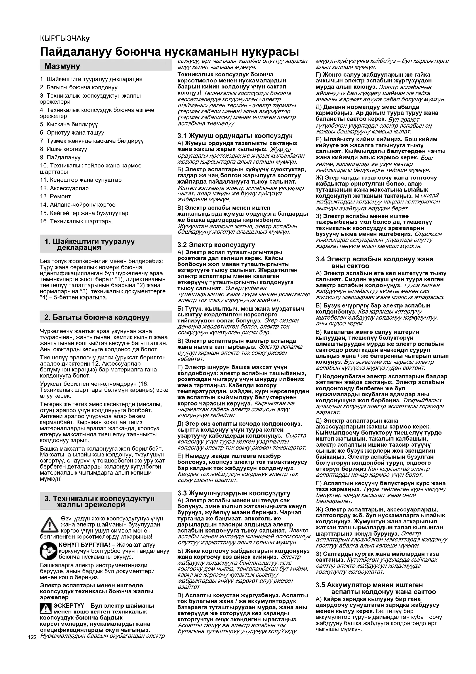 Пайдалануу боюнча нускаманын нукурасы 1. Шайкештиги тууралуу декларация2. Багыты боюнча колдонуу3. Техникалык коопсуздуктун жалпы эрежелери4. Техникалык коопсуздук боюнча өзгөчө эрежелер5. Кыскача билдирүү6. Орнотуу жана ташуу7. Түзмөк жөнүндө кыскача билдирүү8. Ишке киргизүү9. Пайдалануу10. Техникалык тейлөө жана кармоо шарттары11. Кеңештер жана сунуштар12. Аксессуарлар13. Ремонт14. Айлана-чөйрөнү коргоо15. Көйгөйлөр жана бузулуулар16. Техникалык шарттарыБиз толук жоопкерчилик менен билдиребиз: Түрү жана сериялык номери боюнча идентификацияланган бул чүркөлөөчү араа төмөнкүлөргө жооп берет: *1), директиванын тиешелүү талаптарынын баарына *2) жана нормаларына *3). техникалык документтерге *4) – 5-беттен карагыла.Чүркөлөөчү жантык араа узунунан жана туурасынан, жантыгынан, кемтик кылып жана жантыгынан кош кыйгач кесүүгө багытталган. Аны оюктарды кесүүгө колдонсо да болот.Тиешелүү аралоочу диски (уруксат берилген аралоо дисктерин 12. Аксессуарлар бөлүмүнөн караңыз) бар материалга гана колдонууга болот. Уруксат берилген чен-өлчөмдөрүн (16. Техникалык шарттары бөлүмүн караңыз) эске алуу керек. Тегерек же тегиз эмес кесиктерди (мисалы, отун) аралоо үчүн колдонуууга болбойт. Анткени аралоо учурунда алар бекем кармалбайт. Кырынан коюлган тегиз материалдарды аралап жатканда, коопсуз өткөрүү максатында тиешелүү таянчыкты колдоонуу зарыл. Башка максатта колдонууга жол берилбейт. Максатына ылайыксыз колдонуу, түзүлүшүн өзгөртүү, өндүрүүчү текшербеген же уруксат бербеген деталдарды колдонуу күтүлбөгөн материалдык чыгымдарга алып келиши мүмкүн! Өзүңүздүн жеке коопсуздугуңуз үчүн жана электр шайманын бузулуудан коргоо үчүн ушул символ менен белгиленген көрсөтмөлөрдү аткарыңыз!КӨҢҮЛ БУРГУЛА! – Жаракат алуу коркунучун болтурбоо үчүн пайдалануу боюнча нускаманы окуңуз.Башкаларга электр инструментиңизди берүүдө, анын бардык бул документтери менен кошо бериңиз.Электр аспаптары менен иштөөдө коопсуздук техникасы боюнча жалпы эрежелерЭСКЕРТҮҮ – Бул электр шайманы менен кошо келген техникалык коопсуздук боюнча бардык көрсөтмөлөрдү, нускамаларды жана спецификацияларды окуп чыгыңыз. Нускамалардын баарын окубагандан электр соккусу, өрт чыгышы жана/же олуттуу жаракат алуу келип чыгышы мүмкүн. Техникалык коопсуздук боюнча көрсөтмөлөр менен нускамалардын баарын кийин колдонуу үчүн сактап коюңуз! Техникалык коопсуздук боюнча көрсөтмөлөрдө колдонулган «электр шайманы» деген термин - электр тармагы (тармак кабели менен) жана аккумуятор (тармак кабелисиз) менен иштеген электр аспабына тиешелүү.
