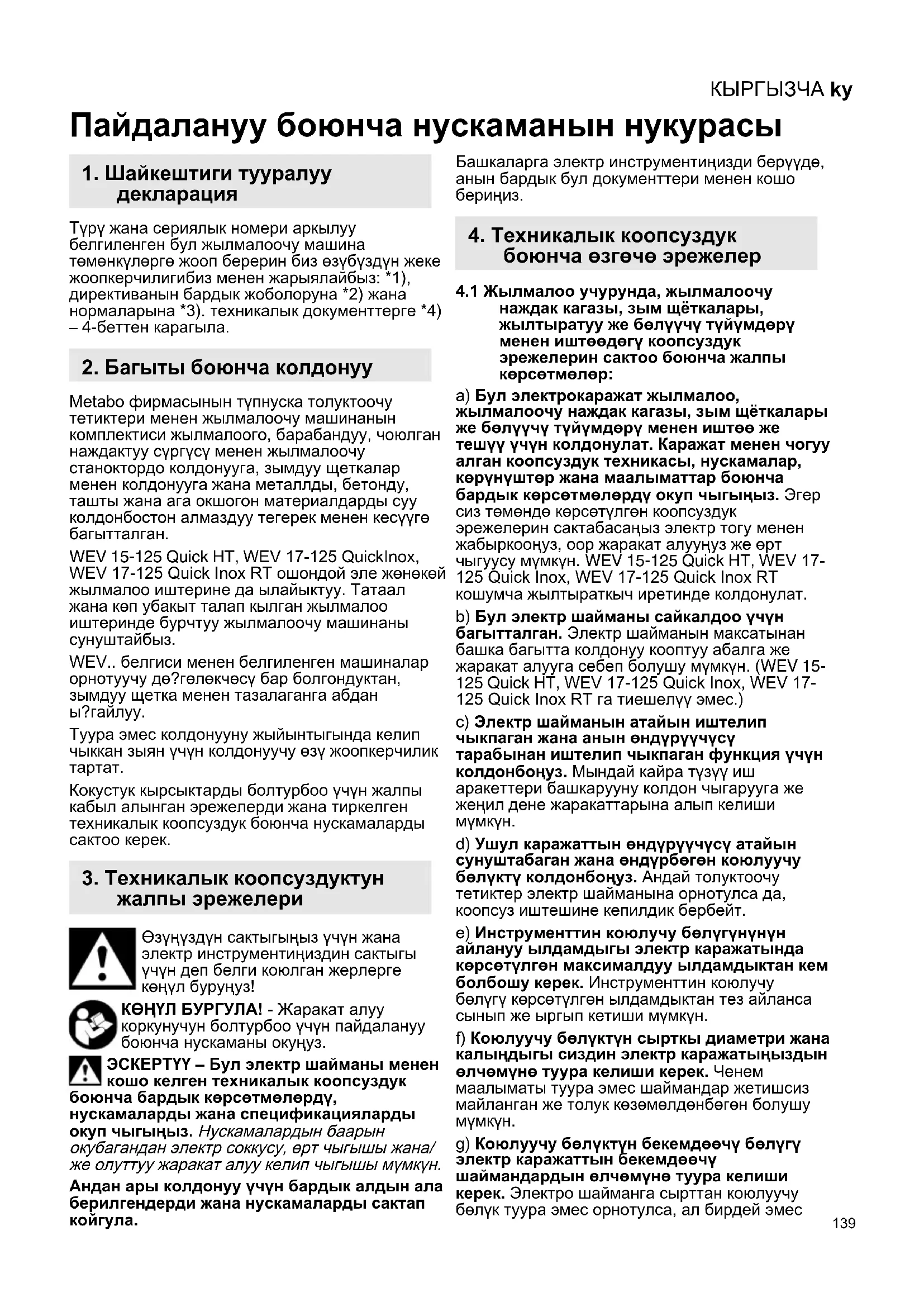 наждак кагазы, зым щёткалары, жылтыратуу же бөлүүчү түйүмдөрү менен иштөөдөгү коопсуздук эрежелерин сактоо боюнча жалпы көрсөтмөлөр: a) Бул электрокаражат жылмалоо, жылмалоочу наждак кагазы, зым щёткалары же бөлүүчү түйүмдөрү менен иштөө же тешүү үчүн колдонулат. Каражат менен чогуу алган коопсуздук техникасы, нускамалар, көрүнүштөр жана маалыматтар боюнча бардык көрсөтмөлөрдү окуп чыгыңыз. Эгер сиз төмөндө көрсөтүлгөн коопсуздук эрежелерин сактабасаңыз электр тогу менен жабыркооңуз, оор жаракат алууңуз же өрт чыгуусу мүмкүн. WEV 15-125 Quick HT, WEV 17- 125 Quick Inox, WEV 17-125 Quick Inox RT кошумча жылтыраткыч иретинде колдонулат. b) Бул электр шайманы сайкалдоо үчүн багытталган. Электр шайманын максатынан башка багытта колдонуу кооптуу абалга же жаракат алууга себеп болушу мүмкүн. (WEV 15- 125 Quick HT, WEV 17-125 Quick Inox, WEV 17- 125 Quick Inox RT га тиешелүү эмес.) c) Электр шайманын атайын иштелип чыкпаган жана анын өндүрүүчүсү тарабынан иштелип чыкпаган функция үчүн колдонбоңуз. Мындай кайра түзүү иш аракеттери башкарууну колдон чыгарууга же жеңил дене жаракаттарына алып келиши