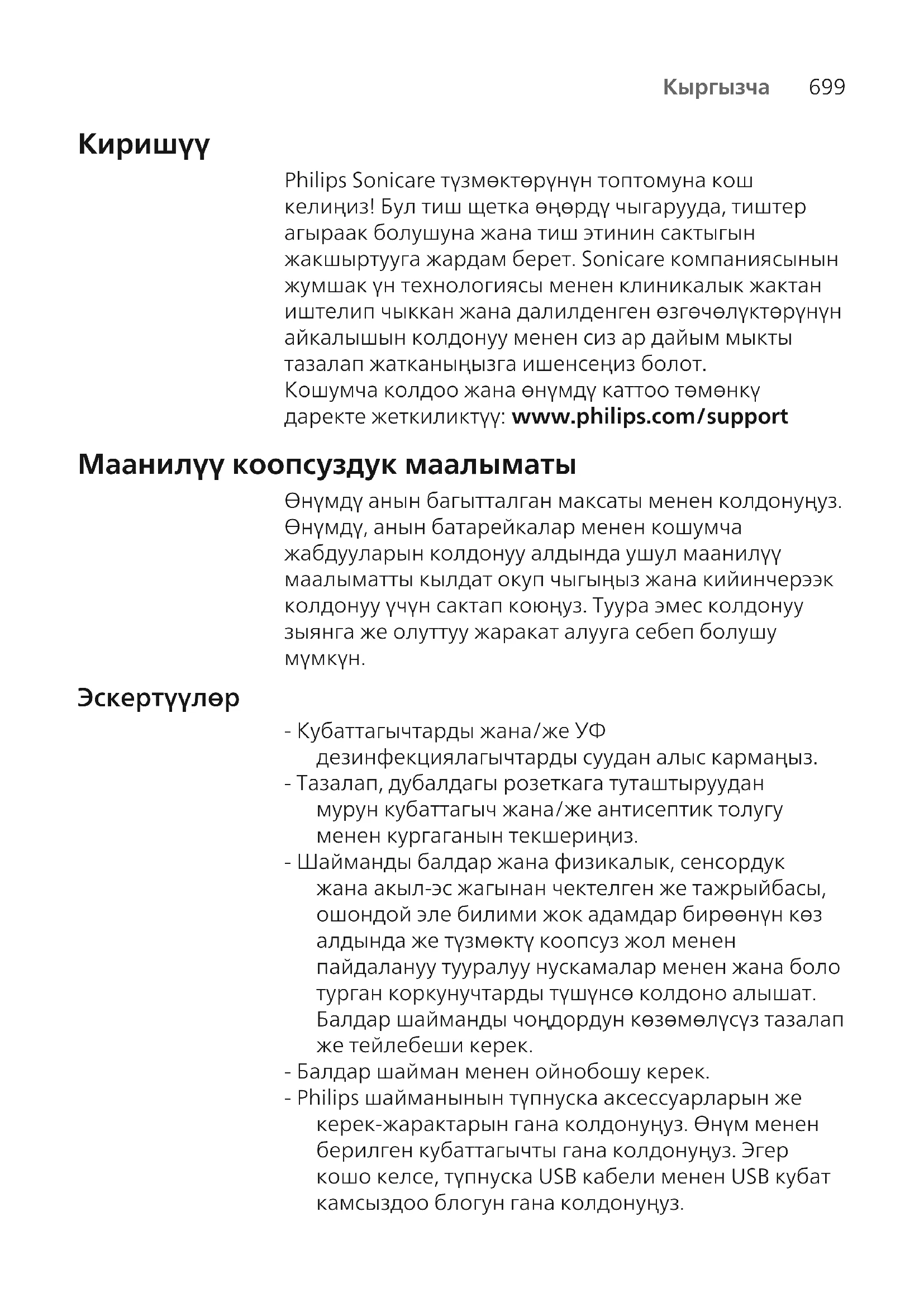 Эскертүүлөр - Кубаттагычтарды жана/же УФ дезинфекциялагычтарды суудан алыс кармаңыз. - Тазалап, дубалдагы розеткага туташтыруудан мурун кубаттагыч жана/же антисептик толугу менен кургаганын текшериңиз. - Шайманды балдар жана физикалык, сенсордук жана акыл-эс жагынан чектелген же тажрыйбасы, ошондой эле билими жок адамдар бирөөнүн көз алдында же түзмөктү коопсуз жол менен пайдалануу тууралуу нускамалар менен жана боло турган коркунучтарды түшүнсө колдоно алышат. Балдар шайманды чоңдордун көзөмөлүсүз тазалап же тейлебеши керек. - Балдар шайман менен ойнобошу керек. - Philips шайманынын түпнуска аксессуарларын же керек-жарактарын гана колдонуңуз. Өнүм менен берилген кубаттагычты гана колдонуңуз. Эгер кошо келсе, түпнуска USB кабели менен USB кубат камсыздоо блогун гана колдонуңуз.700