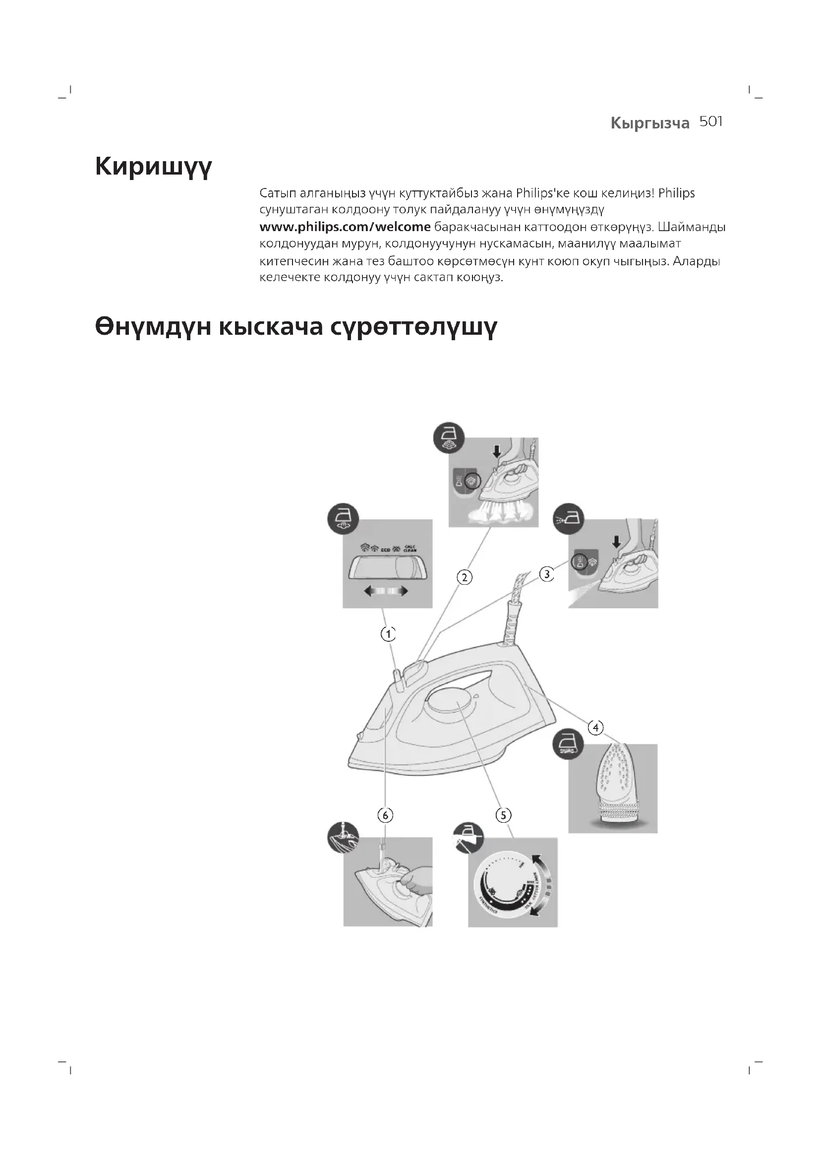 Сатып алганыңыз үчүн куттуктайбыз жана Philips'ке кош келиңиз! Philips сунуштаган колдоону толук пайдалануу үчүн өнүмүңүздү www.philips.com/welcome баракчасынан каттоодон өткөрүңүз. Шайманды колдонуудан мурун, колдонуучунун нускамасын, маанилүү маалымат китепчесин жана тез баштоо көрсөтмөсүн кунт коюп окуп чыгыңыз. Аларды келечекте колдонуу үчүн сактап коюңуз. Өнүмдүн кыскача сүрөттөлүшү