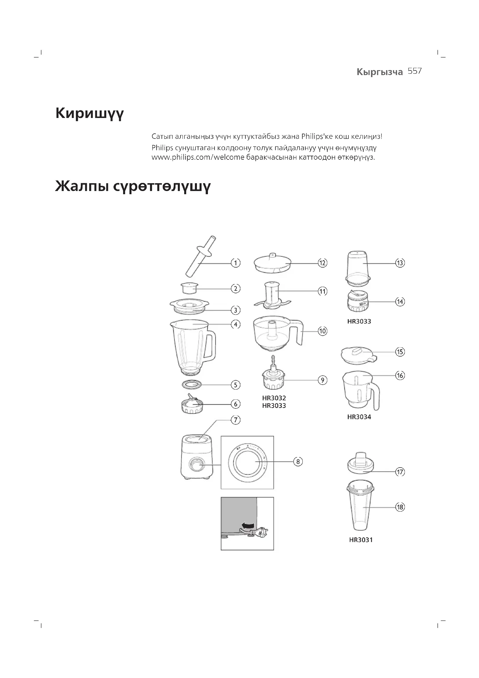 Сатып алганыңыз үчүн куттуктайбыз жана Philips'ке кош келиңиз! Philips сунуштаган колдоону толук пайдалануу үчүн өнүмүңүздү www.philips.com/welcome баракчасынан каттоодон өткөрүңүз. Жалпы сүрөттөлүшү HR3034HR3031 HR3033HR3032 HR3033