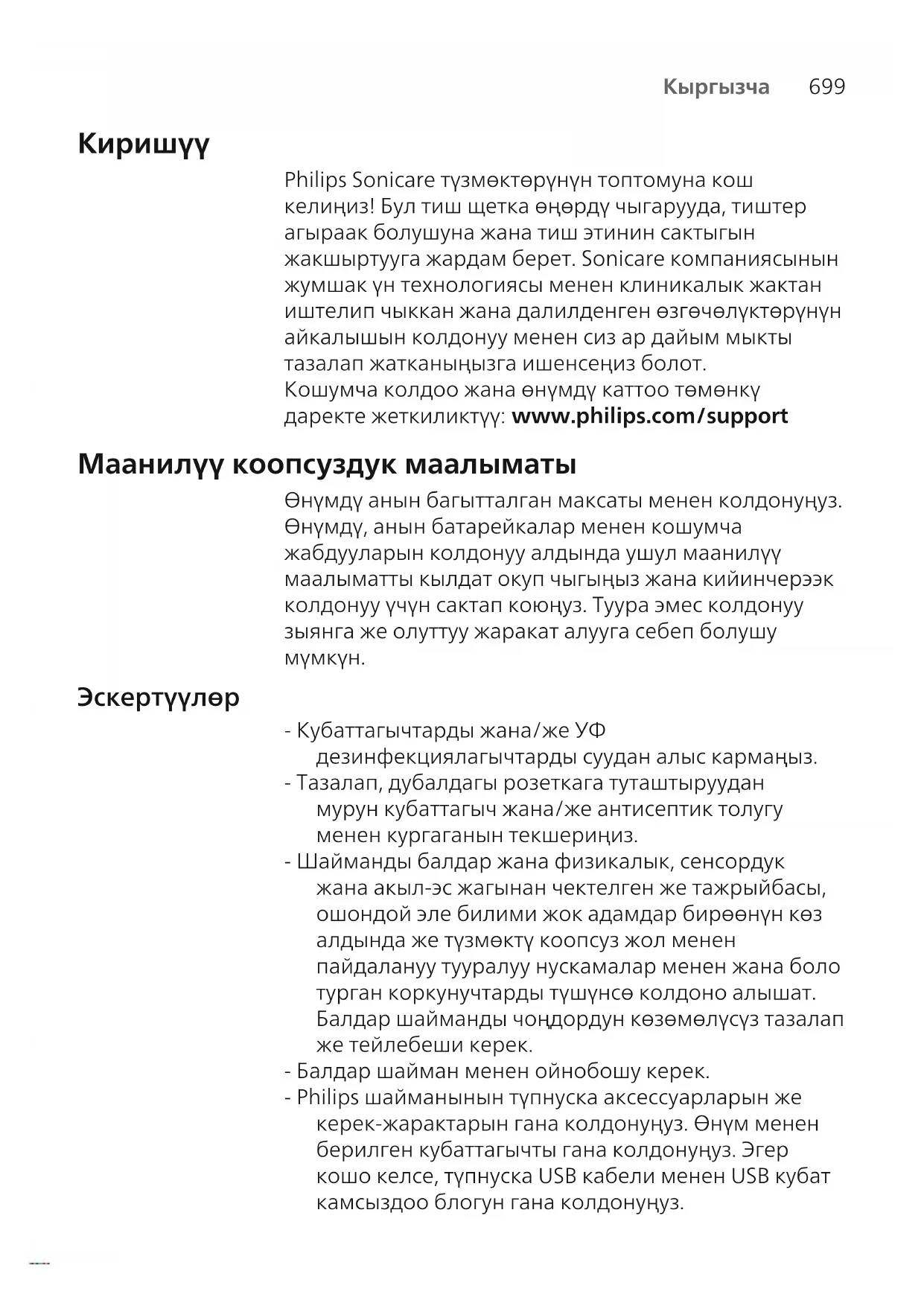 Эскертүүлөр - Кубаттагычтарды жана/же УФ дезинфекциялагычтарды суудан алыс кармаңыз. - Тазалап, дубалдагы розеткага туташтыруудан мурун кубаттагыч жана/же антисептик толугу менен кургаганын текшериңиз. - Шайманды балдар жана физикалык, сенсордук жана акыл-эс жагынан чектелген же тажрыйбасы, ошондой эле билими жок адамдар бирөөнүн көз алдында же түзмөктү коопсуз жол менен пайдалануу тууралуу нускамалар менен жана боло турган коркунучтарды түшүнсө колдоно алышат. Балдар шайманды чоңдордун көзөмөлүсүз тазалап же тейлебеши керек. - Балдар шайман менен ойнобошу керек. - Philips шайманынын түпнуска аксессуарларын же керек-жарактарын гана колдонуңуз. Өнүм менен берилген кубаттагычты гана колдонуңуз. Эгер кошо келсе, түпнуска USB кабели менен USB кубат камсыздоо блогун гана колдонуңуз.700