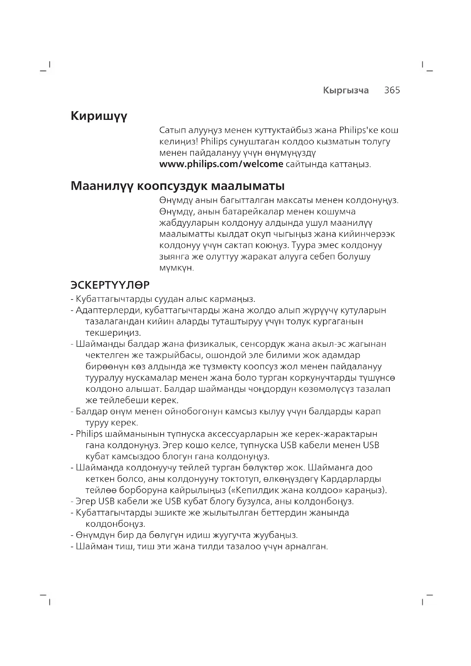- Бул шайманда атайын билими бар адамдар чыгара ала турган батареялар колдонулат. - Өнүмдү 32 °F / 0°C жана 104 °F / 40°C ортосундагы температурада гана кубаттап жана колдонуңуз. - Өнүмдү анын багытталган максаты менен колдонуңуз. Өнүмдү, анын батарейкалар менен кошумча жабдууларын колдонуу алдында ушул маалыматты кылдат окуп чыгыңыз жана кийинчерээк колдонуу үчүн сактап коюңуз. Туура эмес колдонуу зыянга же олуттуу жаракат алууга себеп болушу мүмкүн. Кошумча жабдуулар өнүмдөрдүн түрүнө карап, айырмаланышы мүмкүн. - Philips шайманынын түпнуска аксессуарларын жана керек-жарактарын гана колдонуңуз. - Шайманды жана батарейкаларды оттон алыс кармап, жана түз тийген күндүн нуруна жана температурасы жогору ысыкта калтырбаңыз.367