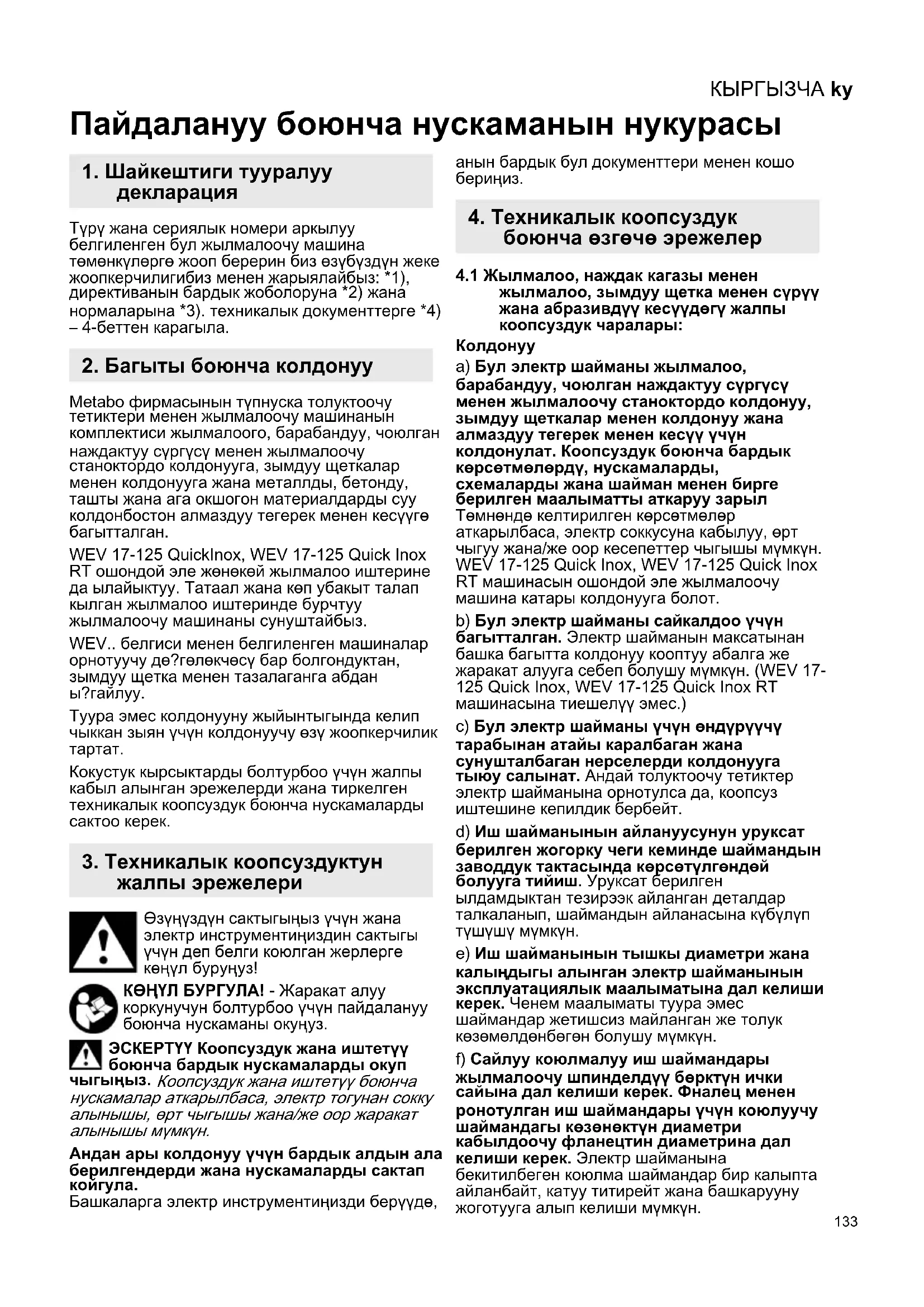 Пайдалануу боюнча нускаманын нукурасы Түрү жана сериялык номери аркылуу белгиленген бул жылмалоочу машина төмөнкүлөргө жооп берерин биз өзүбүздүн жеке жоопкерчилигибиз менен жарыялайбыз: *1), директиванын бардык жоболоруна *2) жана нормаларына *3). техникалык документтерге *4) – 4-беттен карагыла. Metabo фирмасынын түпнуска толуктоочу тетиктери менен жылмалоочу машинанын комплектиси жылмалоого, барабандуу, чоюлган наждактуу сүргүсү менен жылмалоочу станоктордо колдонууга, зымдуу щеткалар менен колдонууга жана металлды, бетонду, ташты жана ага окшогон материалдарды суу колдонбостон алмаздуу тегерек менен кесүүгө багытталган. WEV 17-125 QuickInox, WEV 17-125 Quick Inox RT ошондой эле жөнөкөй жылмалоо иштерине да ылайыктуу. Татаал жана көп убакыт талап кылган жылмалоо иштеринде бурчтуу жылмалоочу машинаны сунуштайбыз. WEV.. белгиси менен белгиленген машиналар орнотуучу дө?гөлөкчөсү бар болгондуктан, зымдуу щетка менен тазалаганга абдан