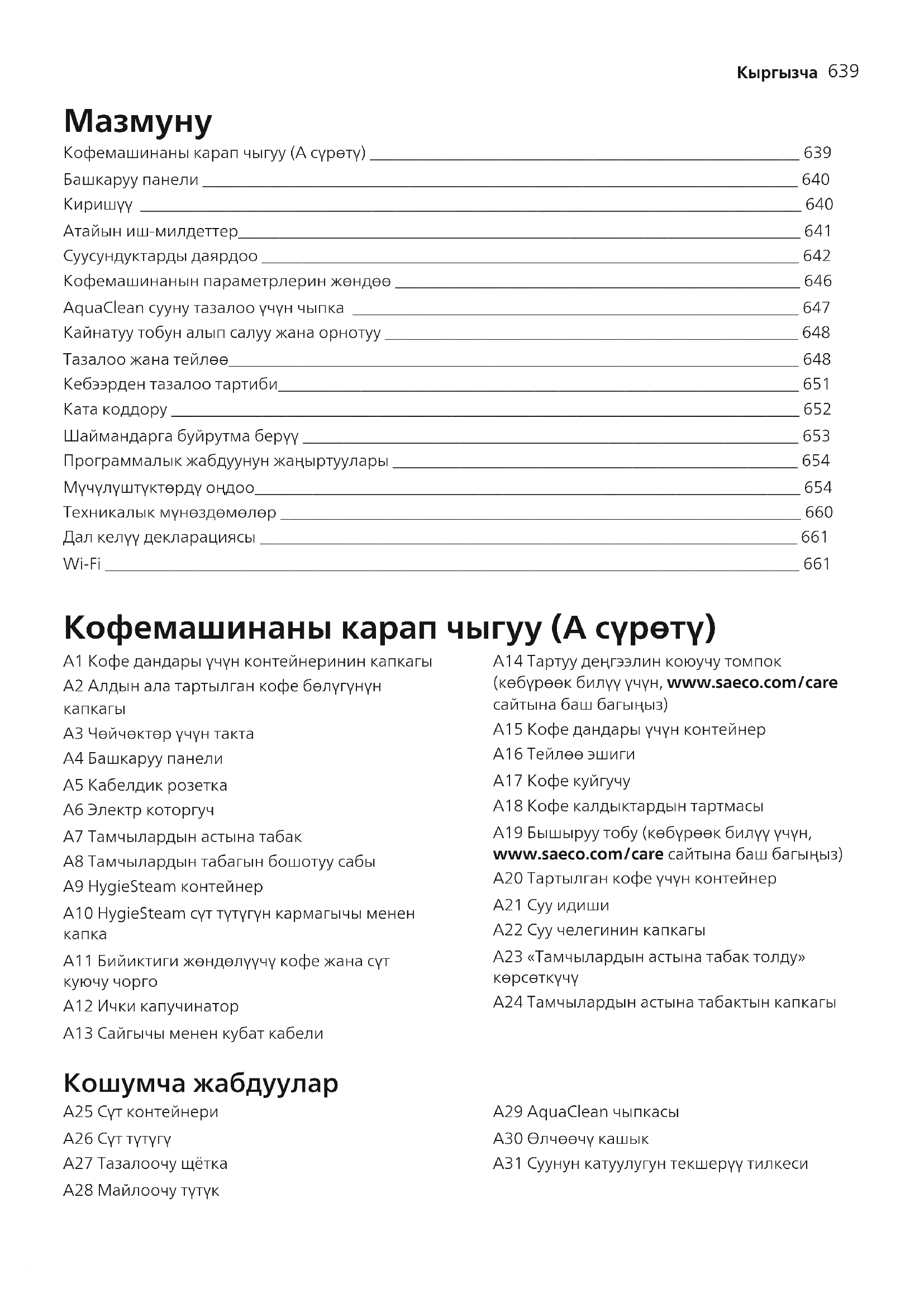 A24 Тамчылардын астына табактын капкагы Кошумча жабдуулар A25 Сүт контейнери A26 Сүт түтүгү A27 Тазалоочу щётка A28 Майлоочу түтүк A29 AquaClean чыпкасы A30 Өлчөөчү кашык A31 Суунун катуулугун текшерүү тилкеси640
