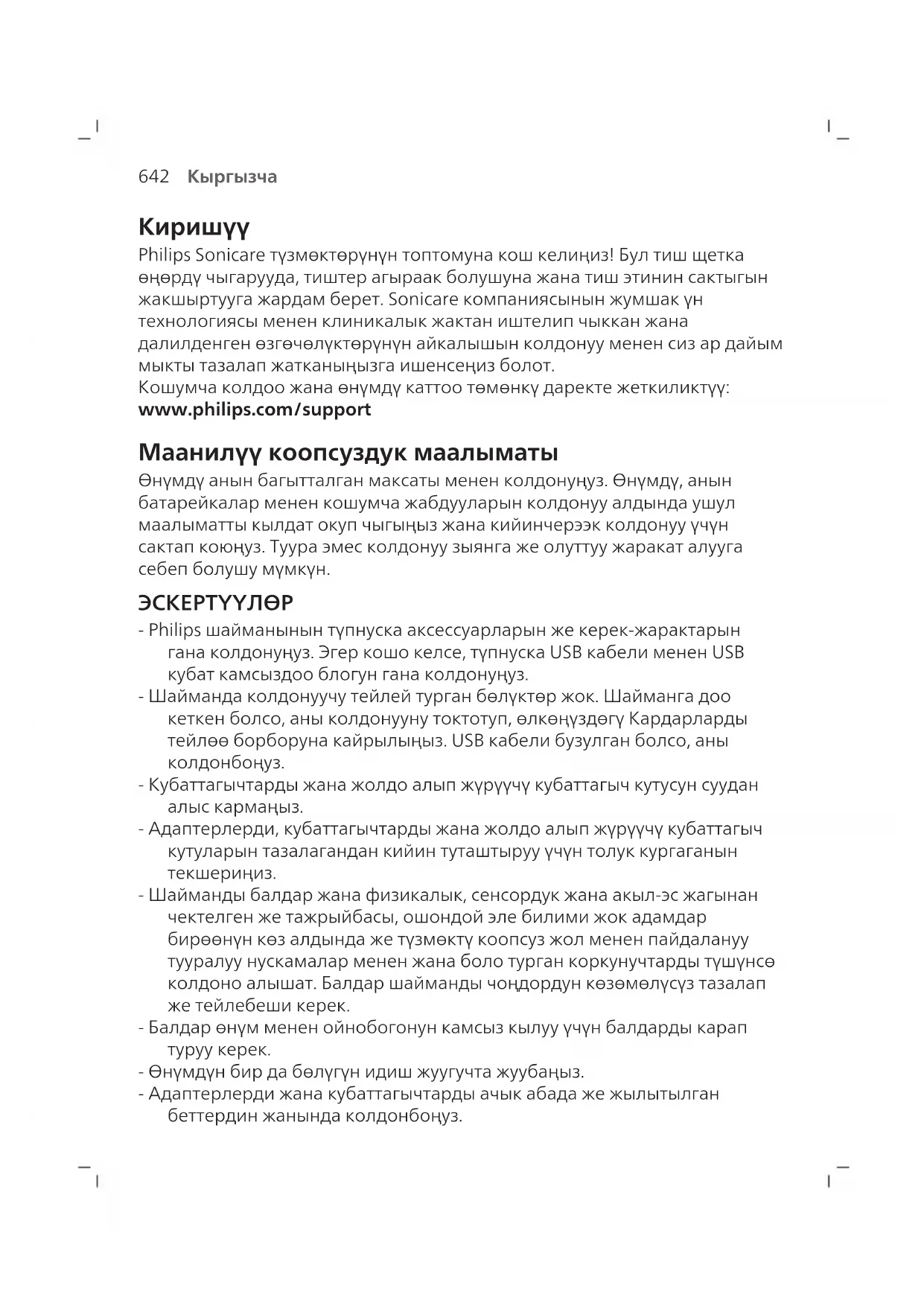 Philips Sonicare түзмөктөрүнүн топтомуна кош келиңиз! Бул тиш щетка өңөрдү чыгарууда, тиштер агыраак болушуна жана тиш этинин сактыгын жакшыртууга жардам берет. Sonicare компаниясынын жумшак үн технологиясы менен клиникалык жактан иштелип чыккан жана далилденген өзгөчөлүктөрүнүн айкалышын колдонуу менен сиз ар дайым мыкты тазалап жатканыңызга ишенсеңиз болот. Кошумча колдоо жана өнүмдү каттоо төмөнкү даректе жеткиликтүү: www.philips.com/support Маанилүү коопсуздук маалыматы Өнүмдү анын багытталган максаты менен колдонуңуз. Өнүмдү, анын батарейкалар менен кошумча жабдууларын колдонуу алдында ушул маалыматты кылдат окуп чыгыңыз жана кийинчерээк колдонуу үчүн сактап коюңуз. Туура эмес колдонуу зыянга же олуттуу жаракат алууга себеп болушу мүмкүн. ЭСКЕРТҮҮЛӨР - Philips шайманынын түпнуска аксессуарларын же керек-жарактарын гана колдонуңуз. Эгер кошо келсе, түпнуска USB кабели менен USB кубат камсыздоо блогун гана колдонуңуз. - Шайманда колдонуучу тейлей турган бөлүктөр жок. Шайманга доо кеткен болсо, аны колдонууну токтотуп, өлкөңүздөгү Кардарларды тейлөө борборуна кайрылыңыз. USB кабели бузулган болсо, аны колдонбоңуз. - Кубаттагычтарды жана жолдо алып жүрүүчү кубаттагыч кутусун суудан алыс кармаңыз. - Адаптерлерди, кубаттагычтарды жана жолдо алып жүрүүчү кубаттагыч кутуларын тазалагандан кийин туташтыруу үчүн толук кургаганын текшериңиз. - Шайманды балдар жана физикалык, сенсордук жана акыл-эс жагынан чектелген же тажрыйбасы, ошондой эле билими жок адамдар бирөөнүн көз алдында же түзмөктү коопсуз жол менен пайдалануу тууралуу нускамалар менен жана боло турган коркунучтарды түшүнсө колдоно алышат. Балдар шайманды чоңдордун көзөмөлүсүз тазалап же тейлебеши керек. - Балдар өнүм менен ойнобогонун камсыз кылуу үчүн балдарды карап туруу керек. - Өнүмдүн бир да бөлүгүн идиш жуугучта жуубаңыз. - Адаптерлерди жана кубаттагычтарды ачык абада же жылытылган беттердин жанында колдонбоңуз.643