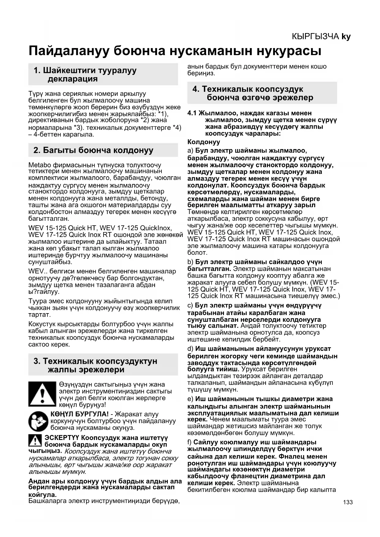 WEV 15-125 Quick HT, WEV 17-125 QuickInox, WEV 17-125 Quick Inox RT owoHDoJ 3ne JKeHKeJ KblMaJoo NwTePnHe Da bIaNbIKTy. TaTaan KaHa KEN y6aKbIT TanaN KbIraH JbJIMaJoo NwTePnHe 6bpTuyy KblMaJooOy MaShuHaHbI cyHyTaJbI3.