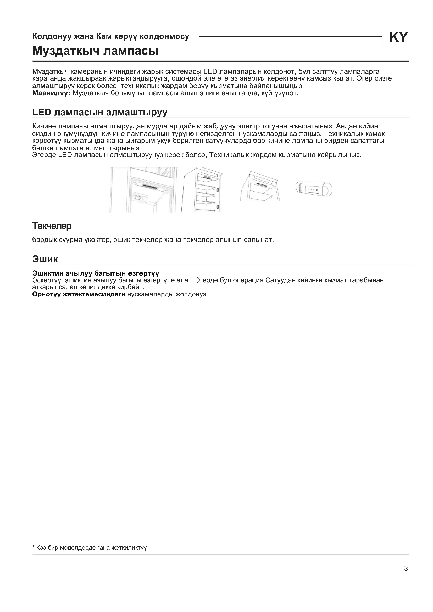 Колдонуу жана Кам көрүү колдонмосу Муздаткыч лампасы Муздаткыч камеранын ичиндеги жарык системасы LED лампаларын колдонот, бул салттуу лампаларга караганда жакшыраак жарыктандырууга, ошондой эле өтө аз энергия керектөөнү камсыз кылат. Эгер сизге алмаштыруу керек болсо, техникалык жардам берүү кызматына байланышыңыз. Маанилүү: Муздаткыч бөлүмүнүн лампасы анын эшиги ачылганда, күйгүзүлөт. LED лампасын алмаштыруу Кичине лампаны алмаштыруудан мурда ар дайым жабдууну электр тогунан ажыратыӊыз. Андан кийин сиздин өнүмүңүздүн кичине лампасынын түрүнѳ негизделген нускамаларды сактаӊыз. Техникалык кѳмѳк кѳрсѳтүү кызматында жана ыйгарым укук берилген сатуучуларда бар кичине лампаны бирдей сапаттагы башка лампага алмаштырыӊыз. Эгерде LED лампасын алмаштырууңуз керек болсо, Техникалык жардам кызматына кайрылыңыз.