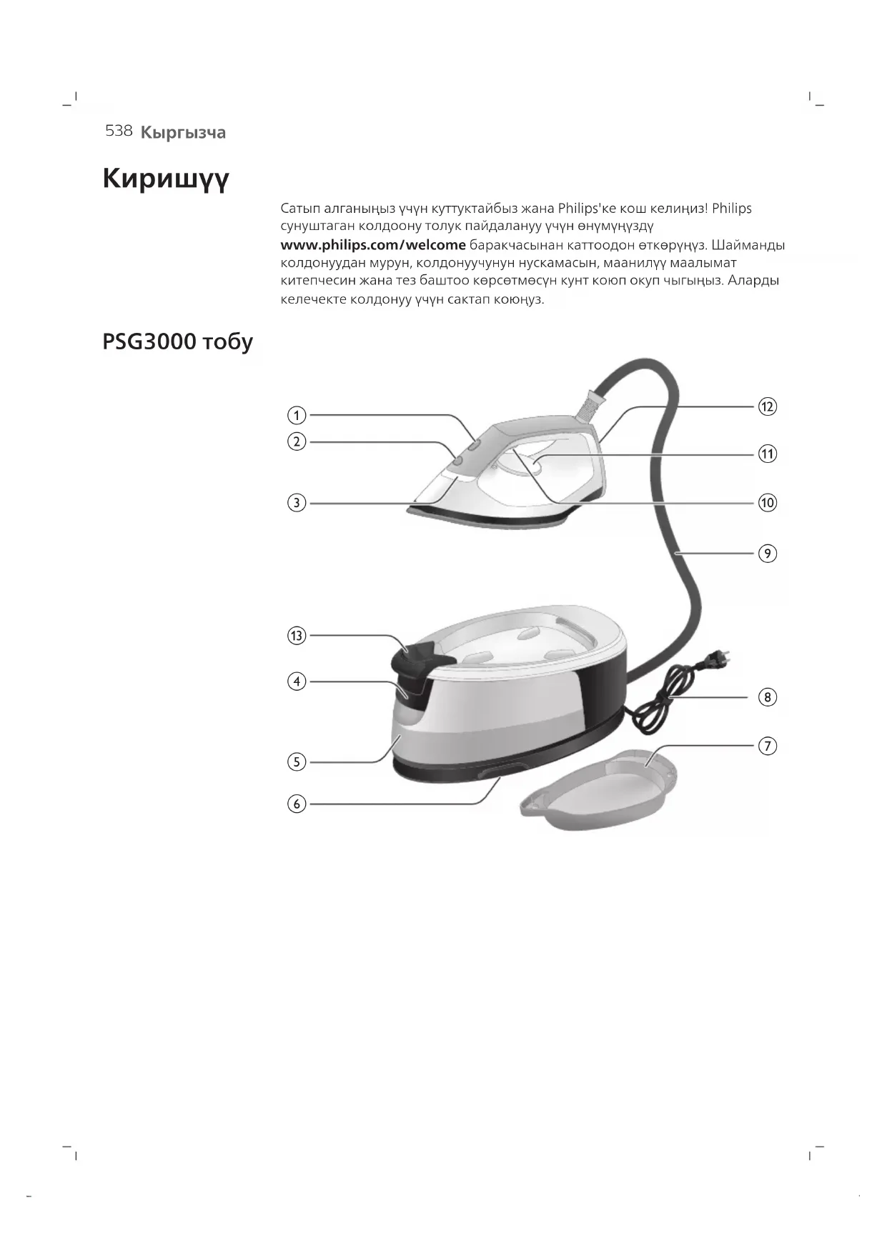 Сатып алганыңыз үчүн куттуктайбыз жана Philips'ке кош келиңиз! Philipsсунуштаган колдоону толук пайдалануу үчүн өнүмүңүздүwww.philips.com/welcome баракчасынан каттоодон өткөрүңүз. Шаймандыколдонуудан мурун, колдонуучунун нускамасын, маанилүү маалыматкитепчесин жана тез баштоо көрсөтмөсүн кунт коюп окуп чыгыңыз. Алардыкелечекте колдонуу үчүн сактап коюңуз. PSG3000 тобу