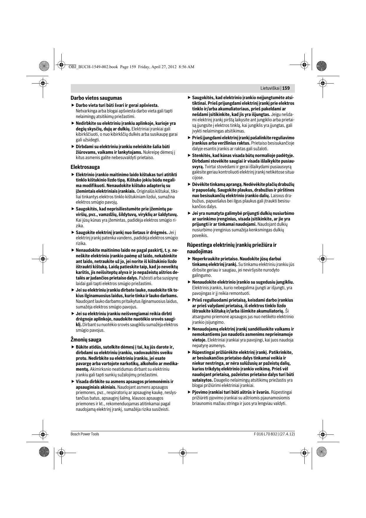 Šioje instrukcijoje pateiktas vibracijos lygis buvo išmatuotas pagal EN 60745 normoje standartizuotą matavimo metodą, ir lyginant elektrinius įrankius jį galima naudoti. Jis skirtas vibracijos poveikiui laikinai įvertinti. F 016 L70 832 | (27.4.12)