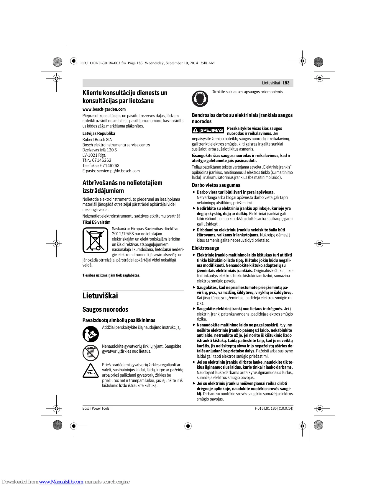 Elektrosauga Elektrinio įrankio maitinimo laido kištukas turi atitikti tinklo kištukinio lizdo tipą. Kištuko jokiu būdu negalima modifikuoti. Nenaudokite kištuko adapterių su įžemintais elektriniais įrankiais. Originalūs kištukai, tiksliai tinkantys elektros tinklo kištukiniam lizdui, sumažina elektros smūgio pavojų. Saugokitės, kad neprisiliestumėte prie įžemintų paviršių, pvz., vamzdžių, šildytuvų, viryklių ar šaldytuvų. Kai jūsų kūnas yra įžemintas, padidėja elektros smūgio rizika. Saugokite elektrinį įrankį nuo lietaus ir drėgmės. Jei į elektrinį įrankį patenka vandens, padidėja elektros smūgio rizika. Nenaudokite maitinimo laido ne pagal paskirtį, t.y. neneškite elektrinio įrankio paėmę už laido, nekabinkite ant laido, netraukite už jo, jei norite iš kištukinio lizdo ištraukti kištuką. Laidą patieskite taip, kad jo neveiktų karštis, jis neišsiteptų alyva ir jo nepažeistų aštrios detalės ar judančios prietaiso dalys. Pažeisti arba susipynę laidai gali tapti elektros smūgio priežastimi. Jei su elektriniu įrankiu dirbate lauke, naudokite tik tokius ilginamuosius laidus, kurie tinka ir lauko darbams. Naudojant lauko darbams pritaikytus ilginamuosius laidus, sumažėja elektros smūgio pavojus. Jei su elektriniu įrankiu neišvengiamai reikia dirbti drėgnoje aplinkoje, naudokite nuotėkio srovės saugiklį. Dirbant su nuotėkio srovės saugikliu sumažėja elektros smūgio pavojus. F 016 L81 185 | (10.9.14)
