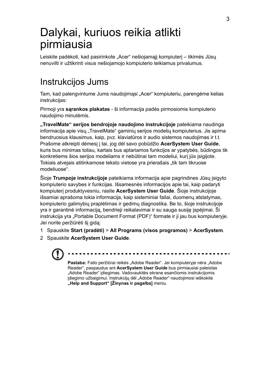 Pastaba: Failo perziūrai reikës „Adobe Reader". Jei kompiuteryne néra „Adobe Reader", paspaudus ant AcerSystem User Guide bus pirmiausiai paleistas „Adobe Reader" jdiegimas. Vadovaukités ekrane esančiomis instrukcjomis jdiegimo użbaiguiim. Instrukcjül del „Adobe Reader" naudojimos iškokite „Help and Support" [Zinynas ir pagalba] menuiu.