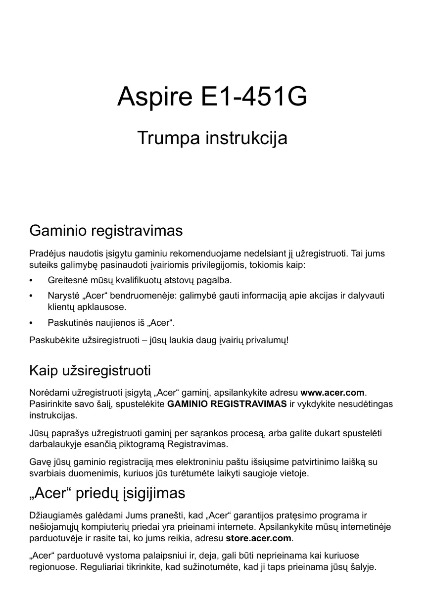 Téléchargez la notice de votre Nešiojamas kompiuteris au format PDF gratuitement ! Retrouvez votre notice ASPIRE E1-451G - ACER et reprennez votre appareil électronique en main. Sur cette page sont publiés tous les documents nécessaires à l'utilisation de votre appareil ASPIRE E1-451G de la marque ACER.